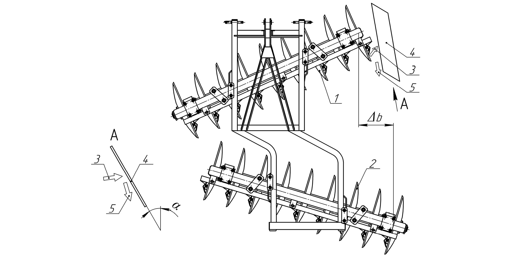 При конструировании традиционной для ягодоводства 1980-х годов дисковой бороны типа БДН-1,3А предполагалось, что технологический процесс должен осуществляться следующим образом. Отброшенные в поперечном направлении крайним диском передней батареи (1) фрагменты почвы будут возвращены в пределы ширины захвата орудия крайним диском задней батареи (2), для чего был предусмотрен ее боковой вынос вправо на величину ∆b (рис. 1). Таким образом, целью данного процесса было достижение ровности поверхности междурядий. В качестве дополнительной опции рекомендовалось использовать установленные справа от крайнего диска подрезающие боковые ножи, способные, в том числе, возвращать отброшенную почву в сторону центра междурядья.