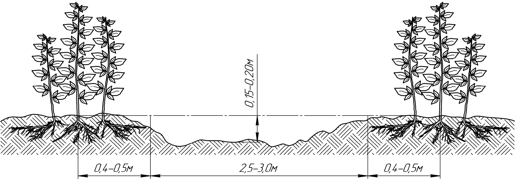Рис. 2. Корытообразная форма поверхности междурядий ягодников на 4-5 год эксплуатации плантации. / Fig. 2. The trough-like shape of the surface of the inter-row spacing of berry bushes at the 4th -5th year of plantation operation.
