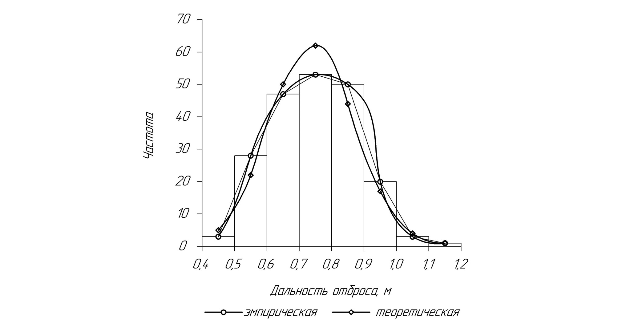 Рис. 3. Эмпирическая и теоретическая кривые распределения дальности поперечного отброса фрагментов почвенной ленты: отсчет графика по оси абсцисс ведется от крайнего диска передней батареи. / Fig. 3. Empirical and theoretical curves of the distribution of the distance of the transverse discarding of soil tape fragments: the graph along the abscissa axis is counted from the outer disk of the front section.