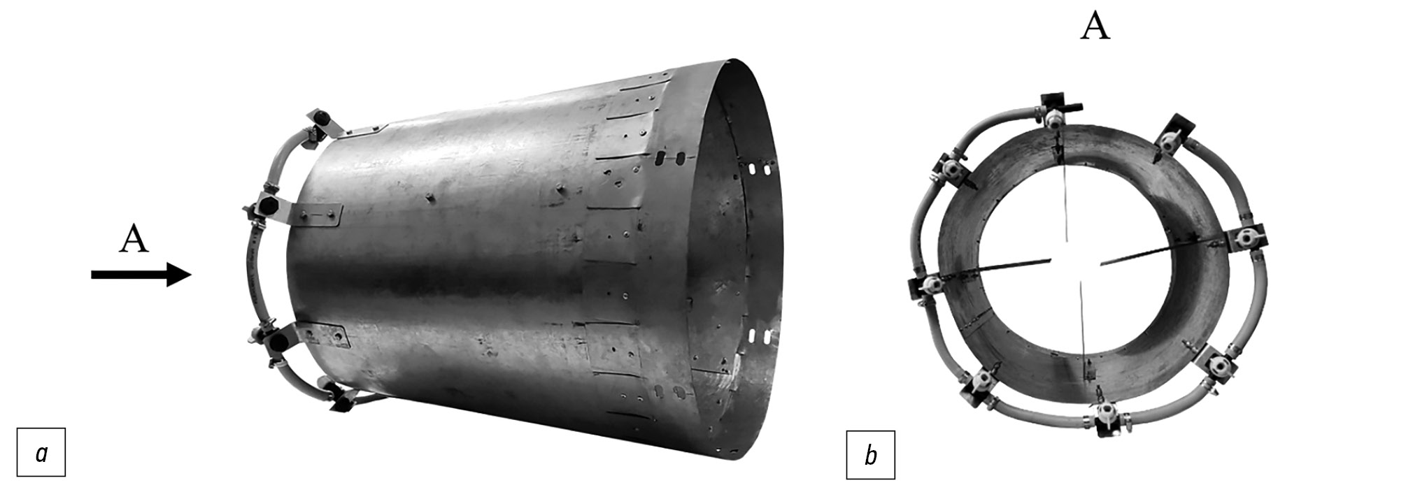 Рис. 2. Общий вид сопла с комплектом щелевых распылителей жидкости на образующей сопла: a) вид сопла сбоку; b) вид А. / Fig. 2. Main view of the nozzle with a set of slotted sprayers on the nozzle’s generatrix: a) the side view; b) the view A.