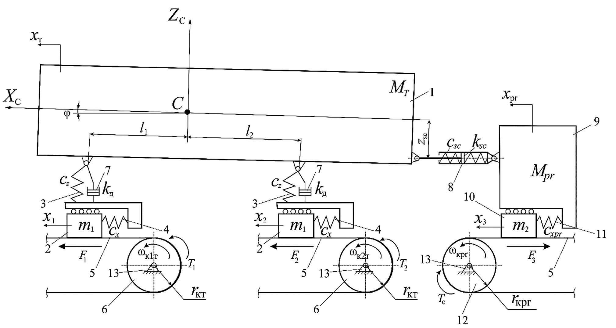 Body 1 has mass МТ and represents the mass of the sprung parts of the towing tractor, while body 9 has mass Мpr and represents the mass of the sprung parts of the trailer. Bodies 2 with mass m1 function as the sliding wheels of a towing tractor. Bodies 1 and 2 are interconnected by a spring 4 with stiffness Cх. To consider the longitudinal–angular oscillations of body 1 along angle, φ we consider the radial rigidity of the towing tractor tire Cz (springs 3) and the radial damping (7) kд of the tractor tire.