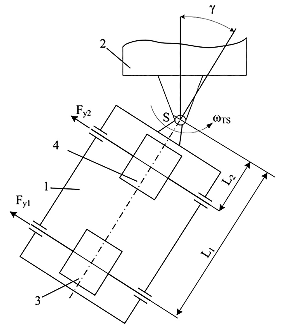We study the conditions for the occurrence of self-oscillatory processes in terms of the folding angle of the tractor–trailer train relative to the coupling point S for the “bicycle” scheme presented in Fig. 2, in which 1 ― towing tractor; 2 ― trailer; 3 ― front wheel; 4 ― rear wheel; γ ― angle of rotation of the longitudinal axis of the towing tractor relative to the longitudinal axis of the trailer; ωтs ― the angular velocity of rotation of the towing tractor relative to the vertical axis passing through the coupling point S; L1, L2 ― distances from point S to the front and rear axles of the towing tractor, respectively; and Fy1, Fy2 ― frictional forces at the total wheel sliding in the zone of the interaction between the front and rear wheels, respectively.