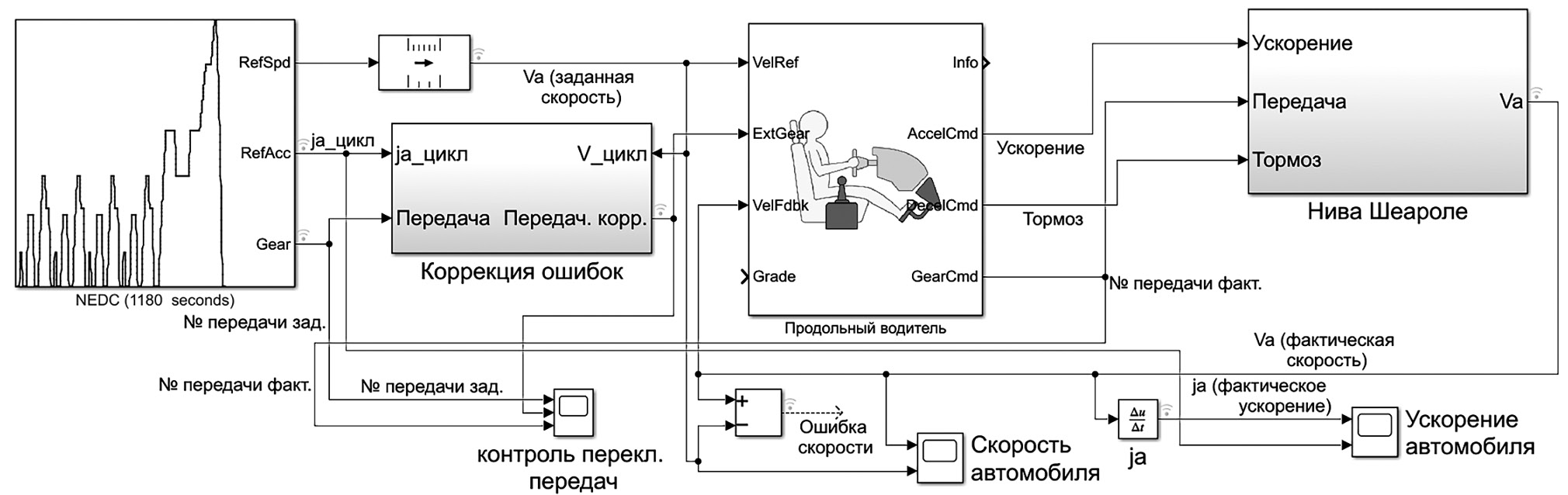 В связи с вышеизложенным, целью данной работы является поиск рациональной структуры модели системы «водитель–автомобиль–окружающая среда» в среде Simulink, позволяющей обеспечить возможность испытания автомобиля в ездовых циклах или при других сценариях движения.