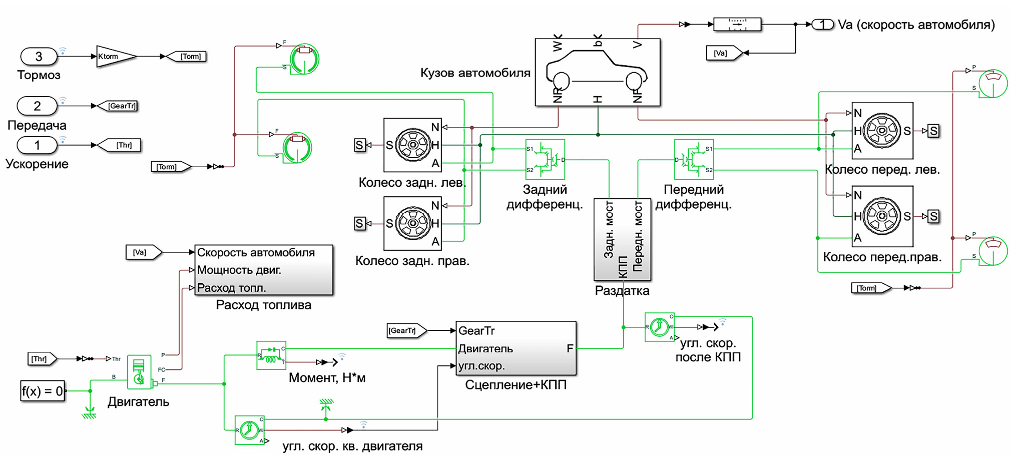 На основе изложенных соображений была получена системная имитационная модель автомобиля, которая представлена на рис. 2. При этом использовалась классическая велосипедная модель кузова автомобиля в виде готового блока и модель ходовой части, состоящая из двигателя, коробки переключения передач со сцеплением, раздаточной коробки, главных передач с дифференциалами и колес, снабжённых соответствующими тормозными механизмами.