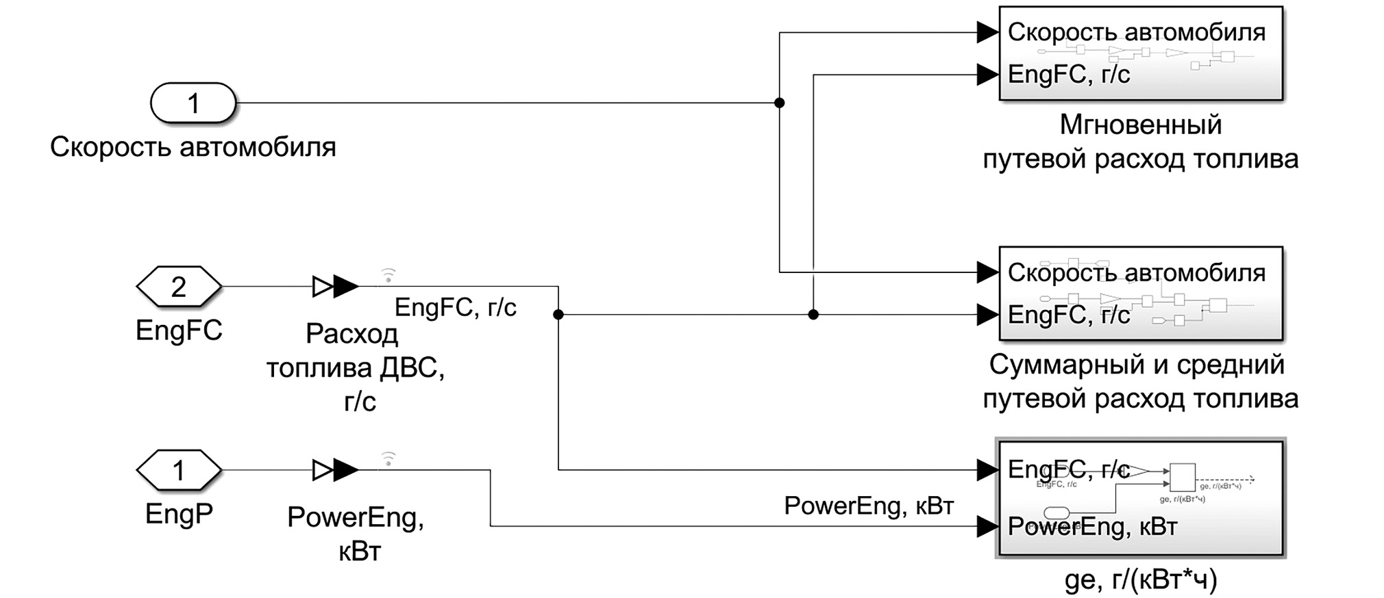 По результатам моделирования определялись: мгновенный удельный эффективный расход топлива, а также мгновенный, суммарный и средний путевые расходы топлива. Модели определения расходов топлива показаны на рис. 3 и 4. Полученные значения регистрировались на всем протяжении ездового цикла.