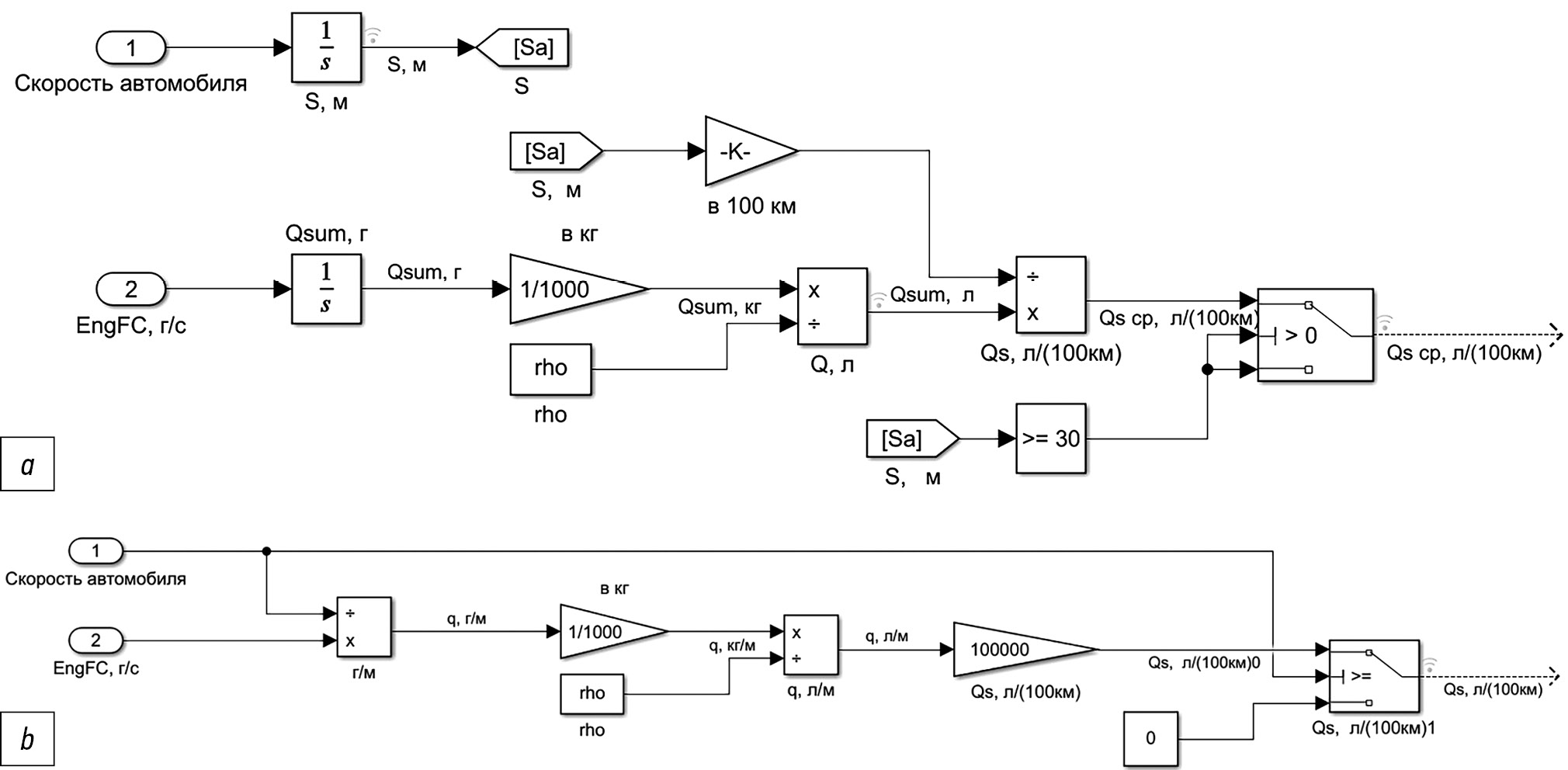 Рис. 4. Модели определения суммарного и среднего путевого (a) и мгновенного путевого (b) расходов топлива в процессе имитации.