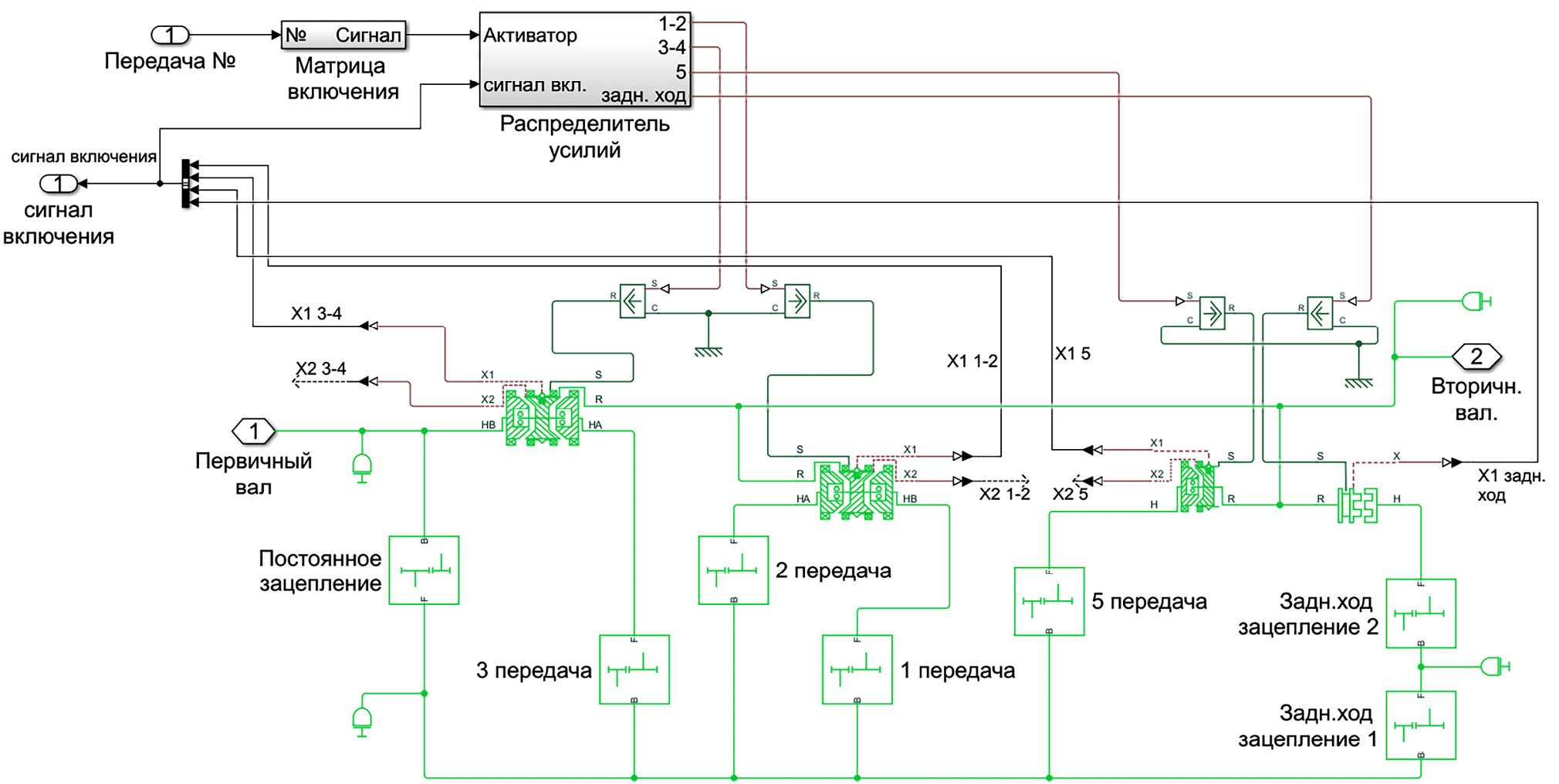 Для моделирования трансмиссии использовались имеющиеся блоки моделирования сцепления, зубчатых передач, дифференциалов и более сложные блоки синхронизаторов.
