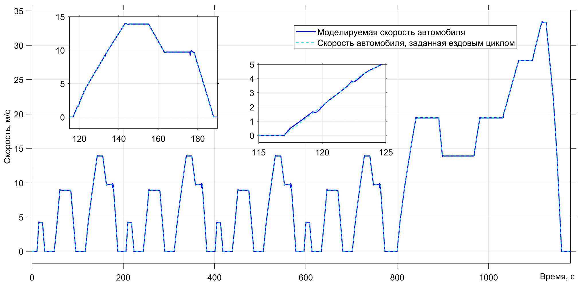 Полученная имитационная модель после отладки показала свою работоспособность. Системы управления обеспечивают движение автомобиля согласно режимам смешанного ездового цикла с соблюдением требуемых допусков (рис. 6).