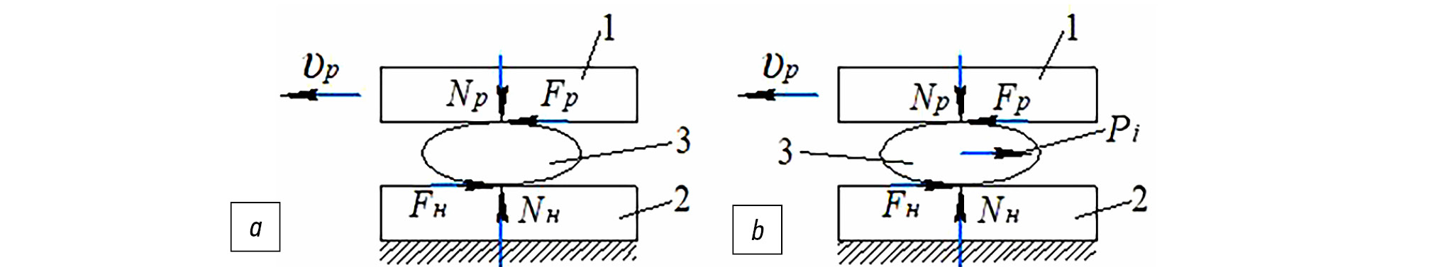 Рис. 3. Схемы для анализа процесса взаимодействия движущегося тела с неподвижной поверхностью через промежуточное тело.