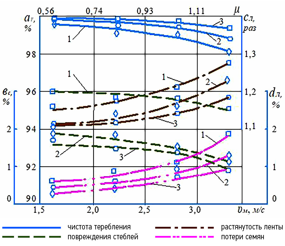 Рис. 7. Зависимость чистоты теребления, потерь семян, растянутости ленты и повреждений стеблей от скорости агрегата у теребильных аппаратов машин: ТЛН- 1,9П — 1; ТЛН-1,9М — 2; ТЛН-1,9К — 3.