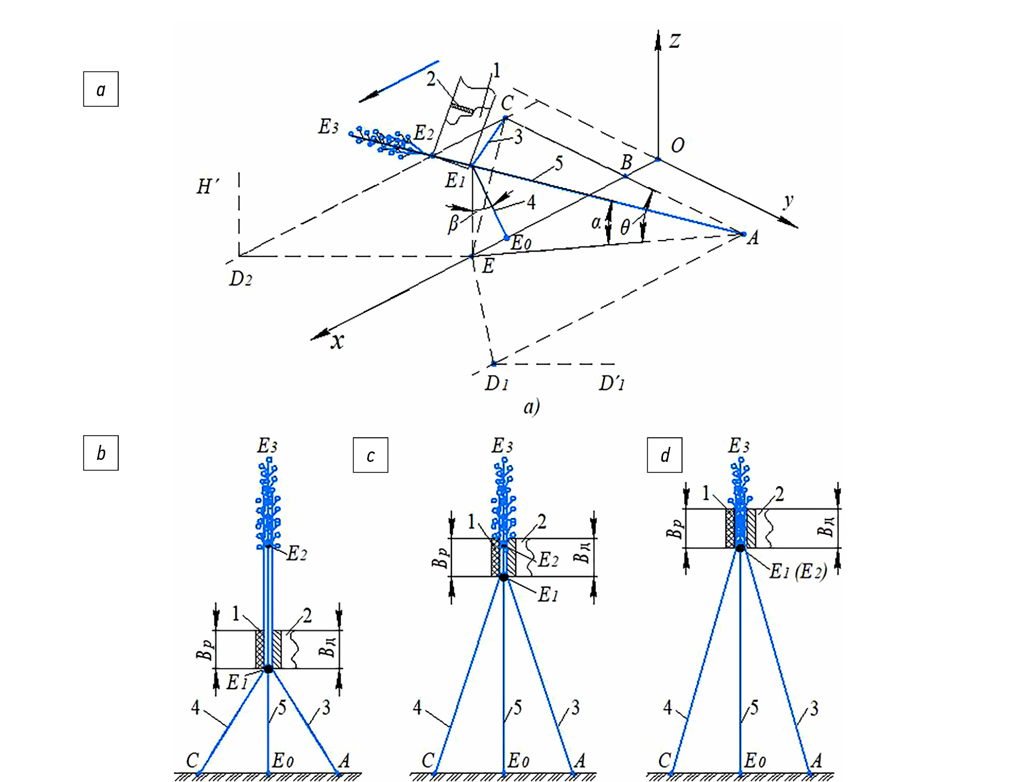 Рис. 5. Схемы к определению возможности теребления короткостебельного льна: а) положение растений и проекции стеблепод- водов делителя D1′D1Е и ЕD2 H′ на горизонтальную плоскость; b, c, d) элементарный пучок растений при воздействии на них делителей; 1 — теребильный ремень; 2 — теребильный диск; 3, 4 — крайние стебли; 5 — центральный стебель.