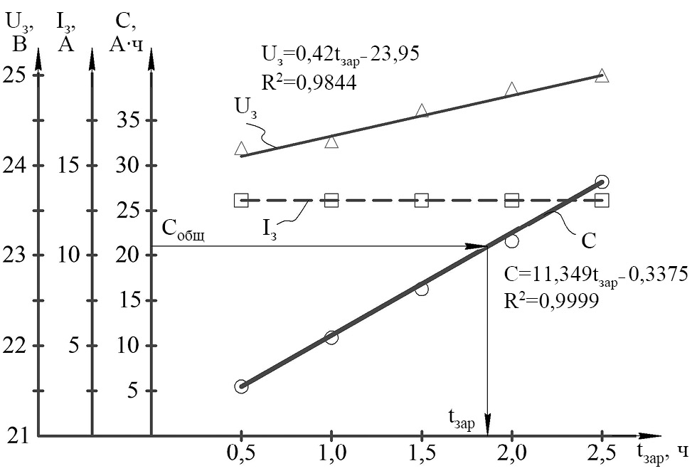 По определенному значению емкости Собщ по выражению (6), используя график восполнения емкости аккумуляторной батарей при заряде (рис. 3), необходимо определить дополнительное время ее заряда: