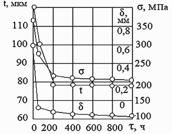 Рис. 1. Изменение выступания t и распрямления δ от наработки двигателя КамАЗ-740 в стендовых условиях, снижение монтажных напряжений в стальной основе шатунных вкладышей σ со стороны рабочей поверхности.