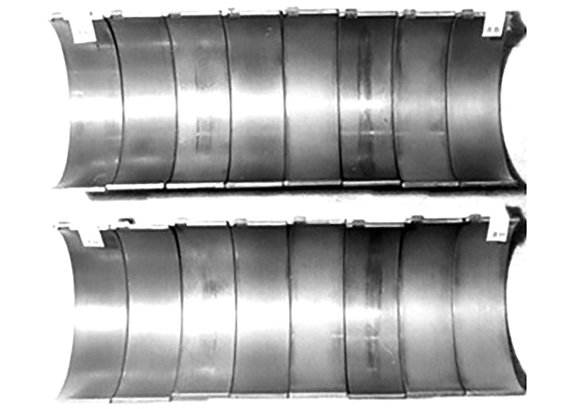 Рис. 3. Вид шатунных вкладышей после испытаний с характерными натирами в средней части по 3 и 6 цилиндрам (слева 1, справа 8 цилиндр).