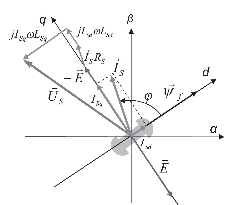 Fig. 1. Vector diagram of an electric motor: α, β ― fixed Cartesian reference frame; d, q ― rotating reference frame; Is ― vector of stator’s current; Rs ― stator’s active resistance; ⃗Us ― vector of stator’s voltage; ω ― rotation velocity of field; Ψf ― flux linkage generated by a permanent magnet; ― vector of electromagnetic induction; Isq, Isd ― components of vector of stator’s current at axes d, q respectively; Lsq, Lsd ― components of vector of stator’s inductance at axes d, q respectively; φ ― angle between the axis q and the vector ; j ― an imaginary unit.