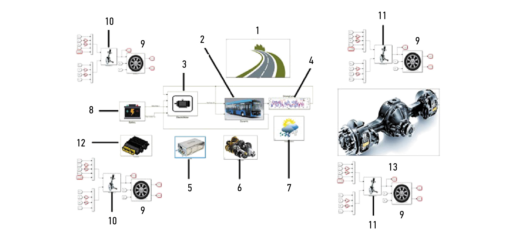 1 — опорное основание; 2 — блок динамики движения; 3 — тяговые электродвигатели; 4 — цикл движения; 5 — тяговые инверторы; 6 — трансмиссия; 7 — климатические условия; 8 — система хранения электрической энергии; 9 — колесо; 10 — передняя подвеска; 11 — задняя подвеска; 12 — система управления; 13 — балка заднего моста.