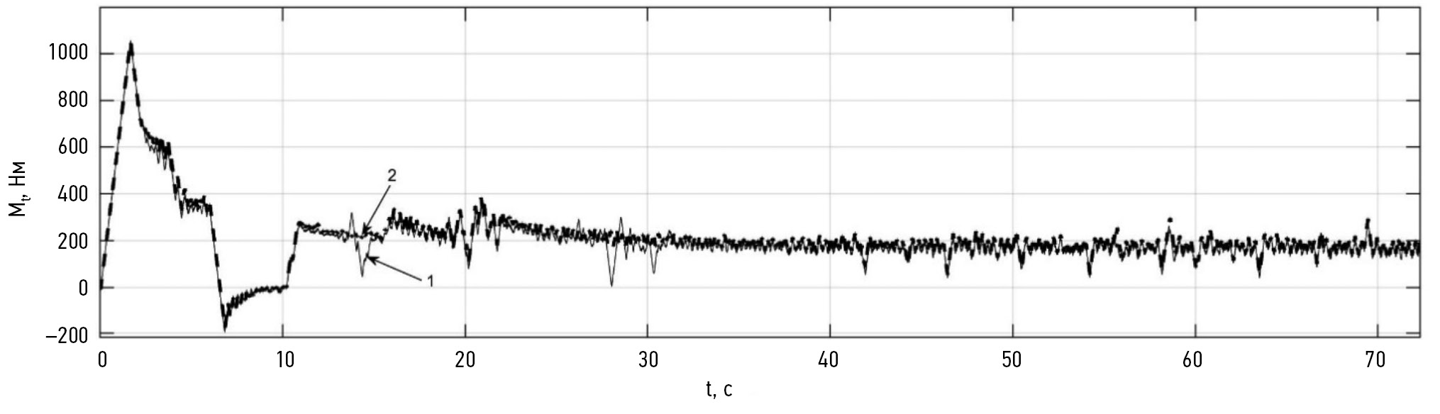 Рис. 5. Реализация мгновенного электрического момента Mt(t) для СДПМ: 1 ― модельное значение электрического момента; 2 ― оценка электрического момента.