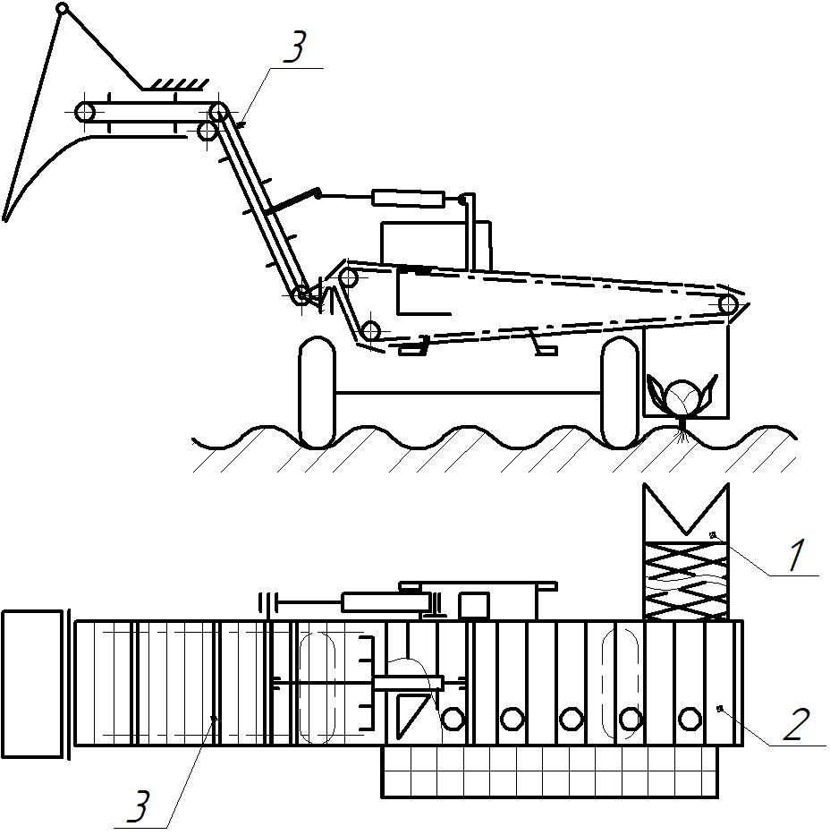 Рис. 1. Схема компоновки многовариантного капустоуборочного комбайна с элеватором: 1 — режущий аппарат; 2 — стол доработки с транспортер-обрезчиком; 3 — элеватор.
