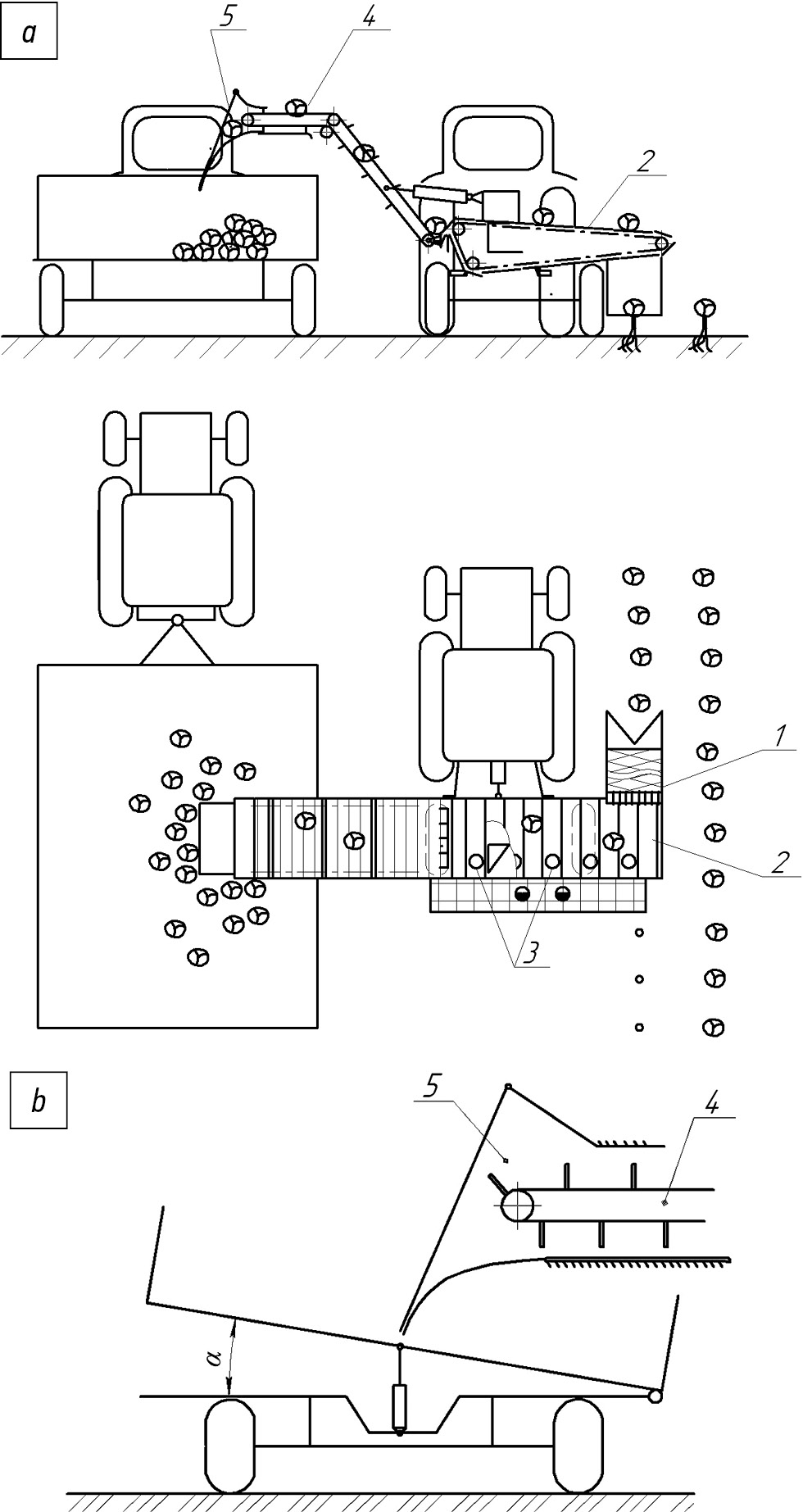 Fig. 4. A variant of the cabbage harvester operation according to the scheme 1: a — general view; b — the installation scheme of the truck body at the beginning of cabbage heads loading.