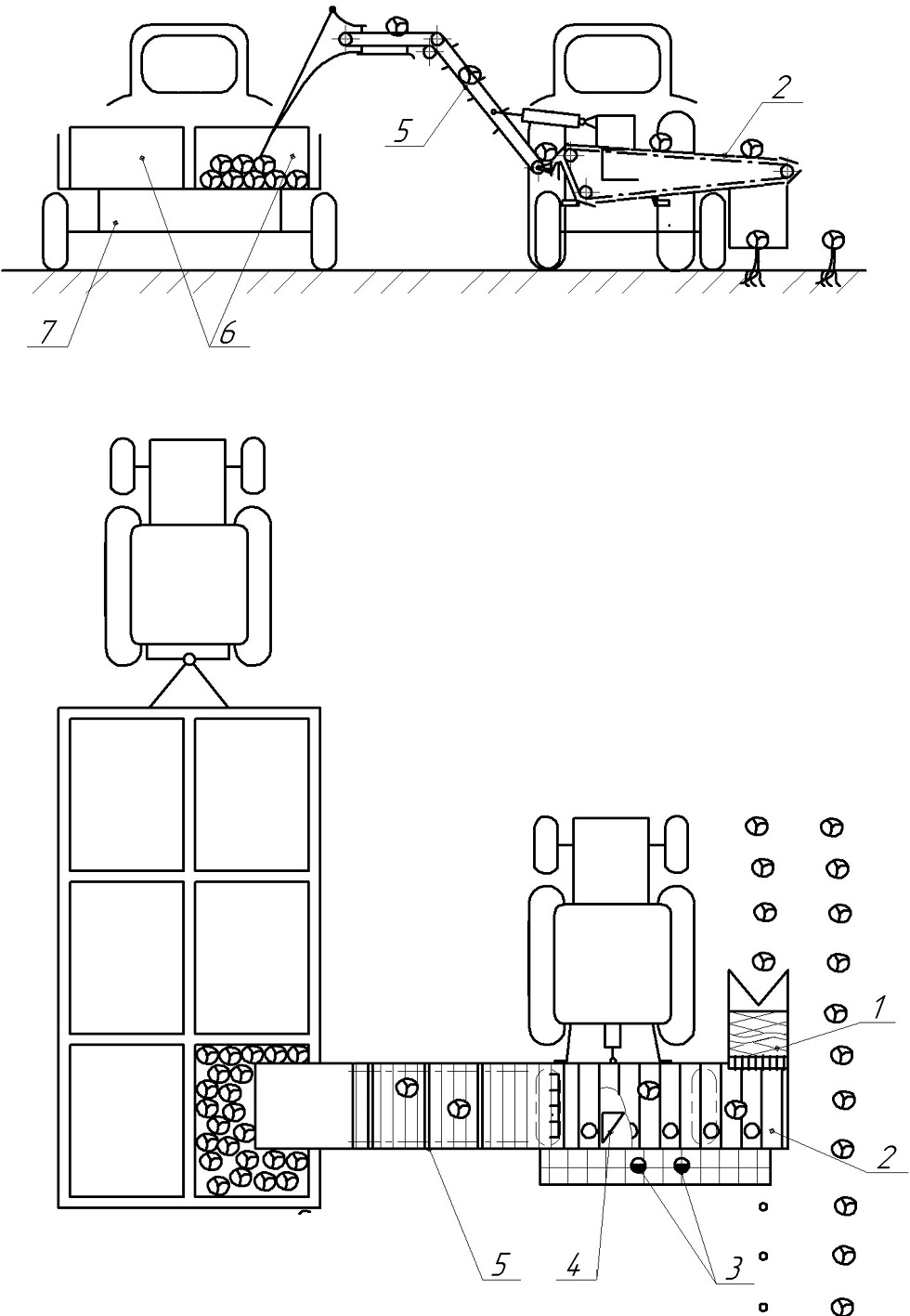 Рассмотренные выше схемы 1–3, на наш взгляд, наиболее предпочтительны при уборке кочанной капусты для краткосрочного хранения, так как кочаны при отгрузке, находясь в свободном полете, хотя на минимальной высоте падения, соударяются с элементами конструкции контейнеров и между собой.