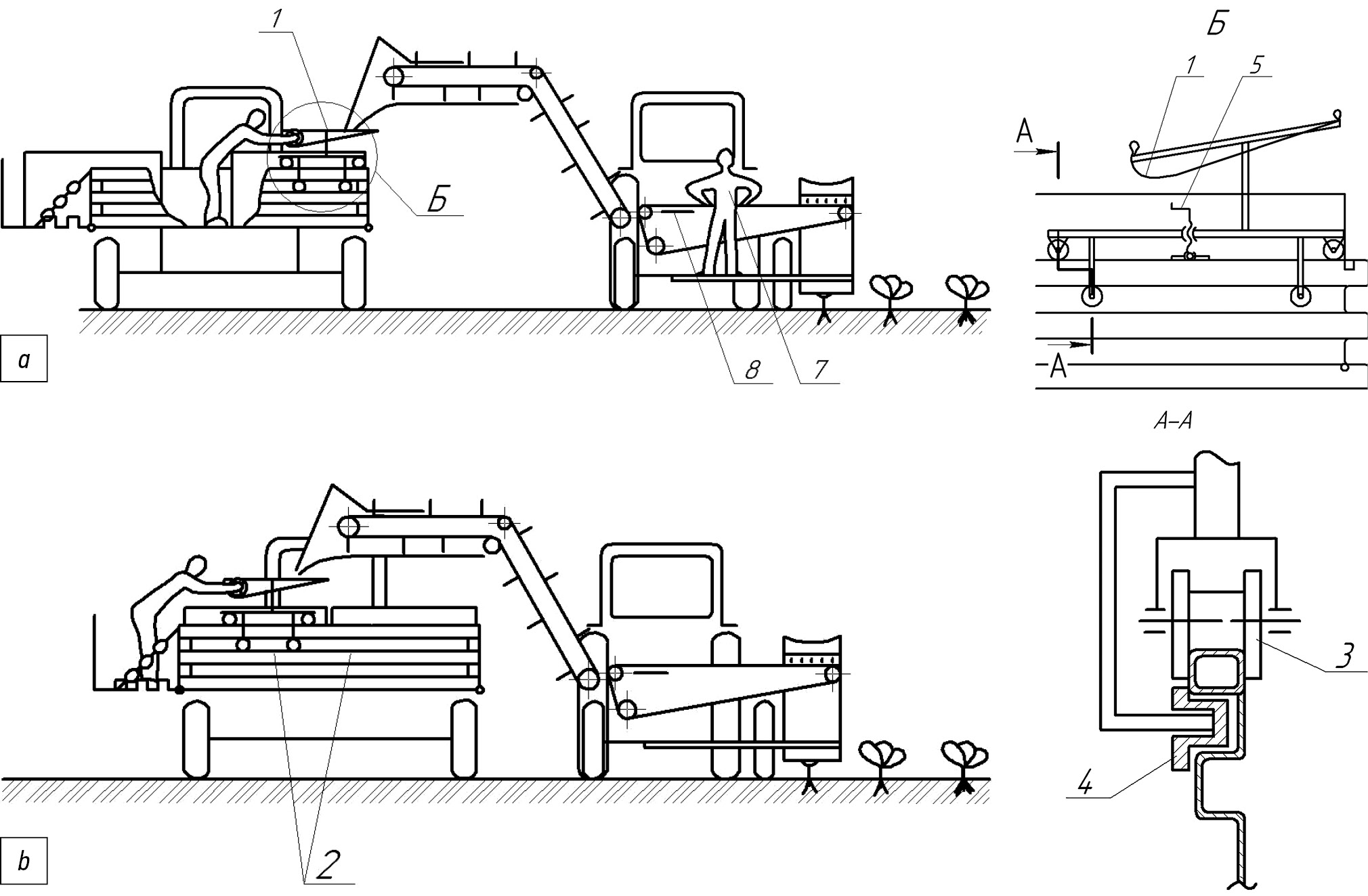 При машинной уборке кочанной капусты по схеме 4 (рис. 7) кочаны сначала отгружаются на гибкий настил 3 корытообразной формы, установленный с помощью специальной стойки на платформе транспортного средства 4 над съемными контейнерами 5. Далее рабочие, находясь на платформе, бережно перекладывают кочаны с настила в контейнеры, ориентируя кочерыгами в сторону бортов. После наполнения контейнеров транспортное средство отправляют в овощехранилище, где с помощью вилочного погрузчика груженные кочанами контейнеры заменяют порожними, оставляя гибкий настил 3 со стойкой на платформе для выполнения следующего цикла работ.