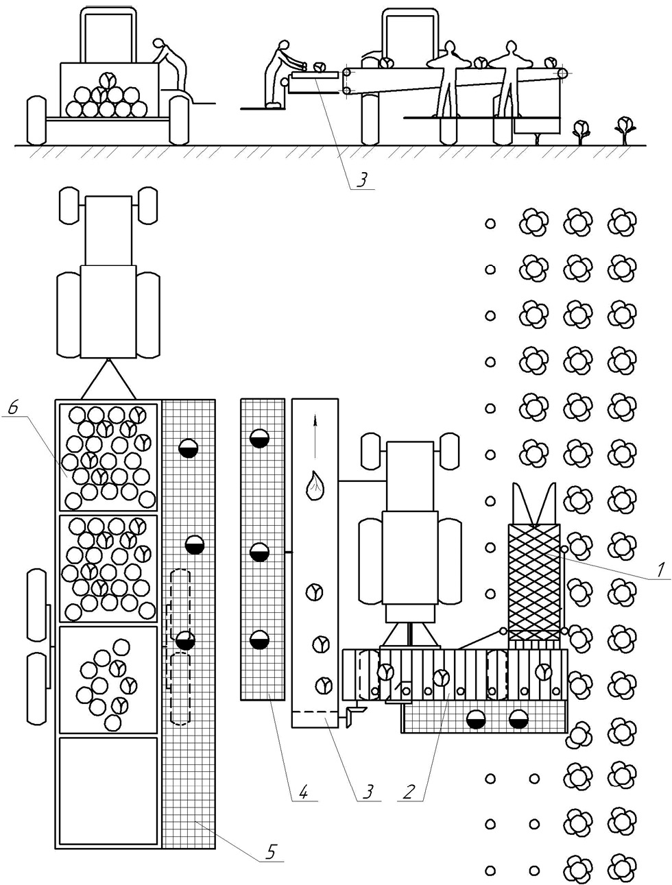 Здесь кочаны инспектируются, нетоварные кочаны размещаются в отверстиях полотна транспортер-обрезчика для повторной обрезки. Далее, кочаны и появившиеся свободные листья направляются на продольный транспортер 3. Затем, рабочие, находящиеся на платформе 4 забирают с полотна продольного транспортера и передают рабочим, находящимся на платформе 5 сопровождающего транспортного средства 6 для укладки их в контейнеры. После наполнения всех контейнеров кочанами капусты транспортное средство отправляется в овощехранилище, где производится смена полных контейнеров порожними.