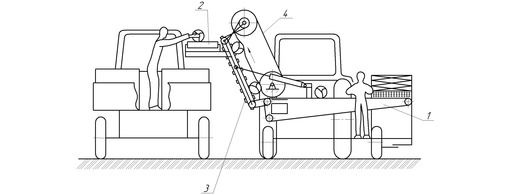 Fig. 3. Layout diagram of the multiple-option cabbage harvester with an up-located longitudinal conveyor: 1 — a cutting machine; 2 — a remedial table with a conveyor-cutter; 3 — an elevator; 4 — the up-located longitudinal conveyor.