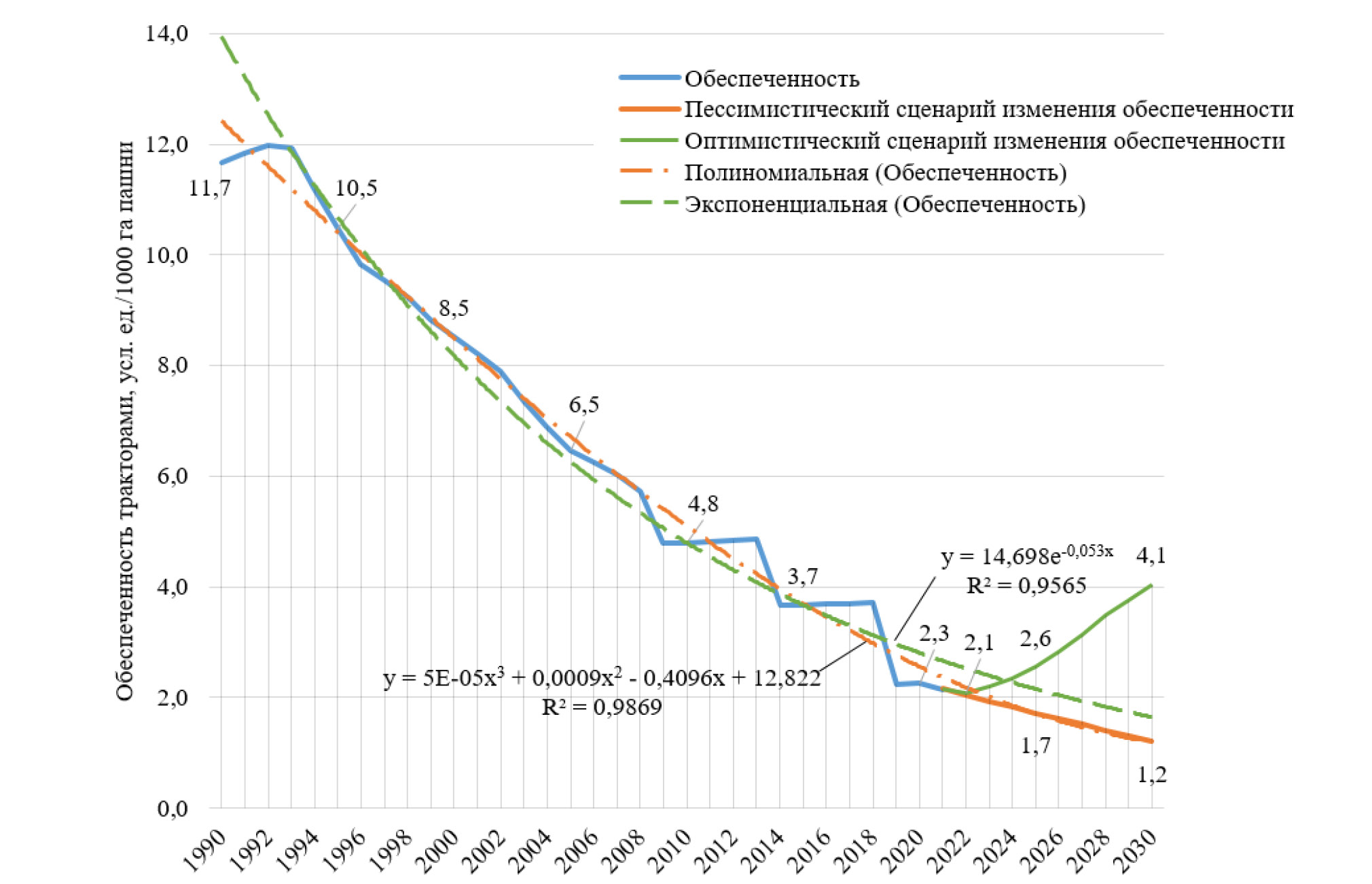 Рис. 2. Прогноз изменения обеспеченности сельскохозяйственными тракторами.