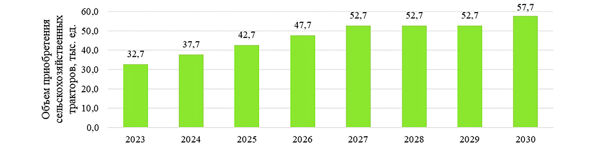 Рис. 3. Целевые объемы приобретения сельскохозяйственных тракторов по годам для реализации оптимистического сценария.