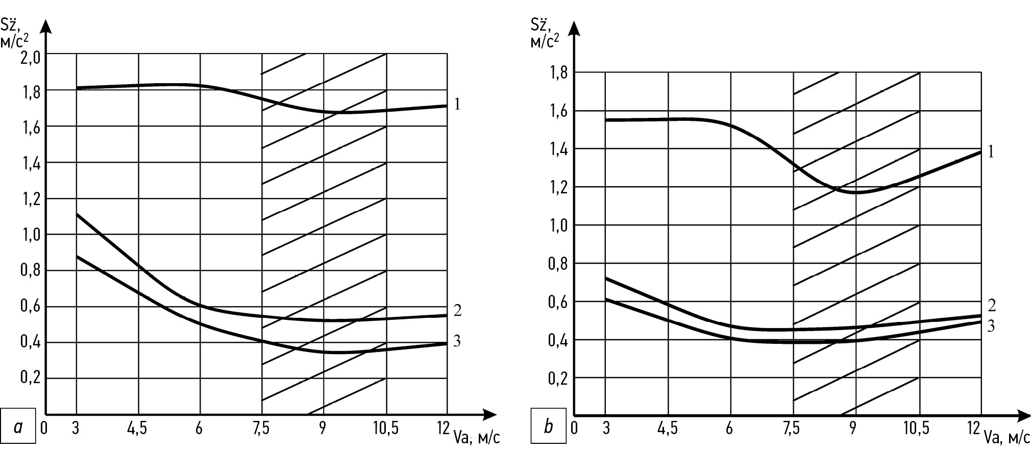 Рис. 2. Зависимость максимального вертикального ускорения на навеске штанг от скорости движения при давлении в шинах: а — 80 кПа; b — 40 кПа. Уровень заполнения бака: 1 — 0%; 2 — 50%; 3 — 100%.