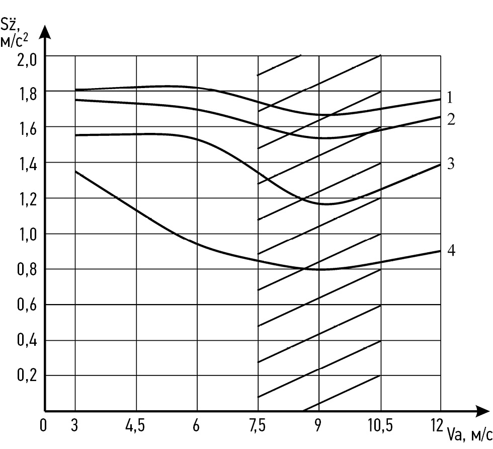 В то же время, на втором диапазоне также резонансная частота смещается с 5 Гц при скорости 3 м/с на 6,3 Гц при скоростях движения МЭС 6, 9 и 12 м/с. Но с увеличением скорости от 3 м/с до 12 м/с в рассматриваемом интервале наблюдается рост ускорения с 0,0725 g до 0,1414 g (в 1,95 раз).
