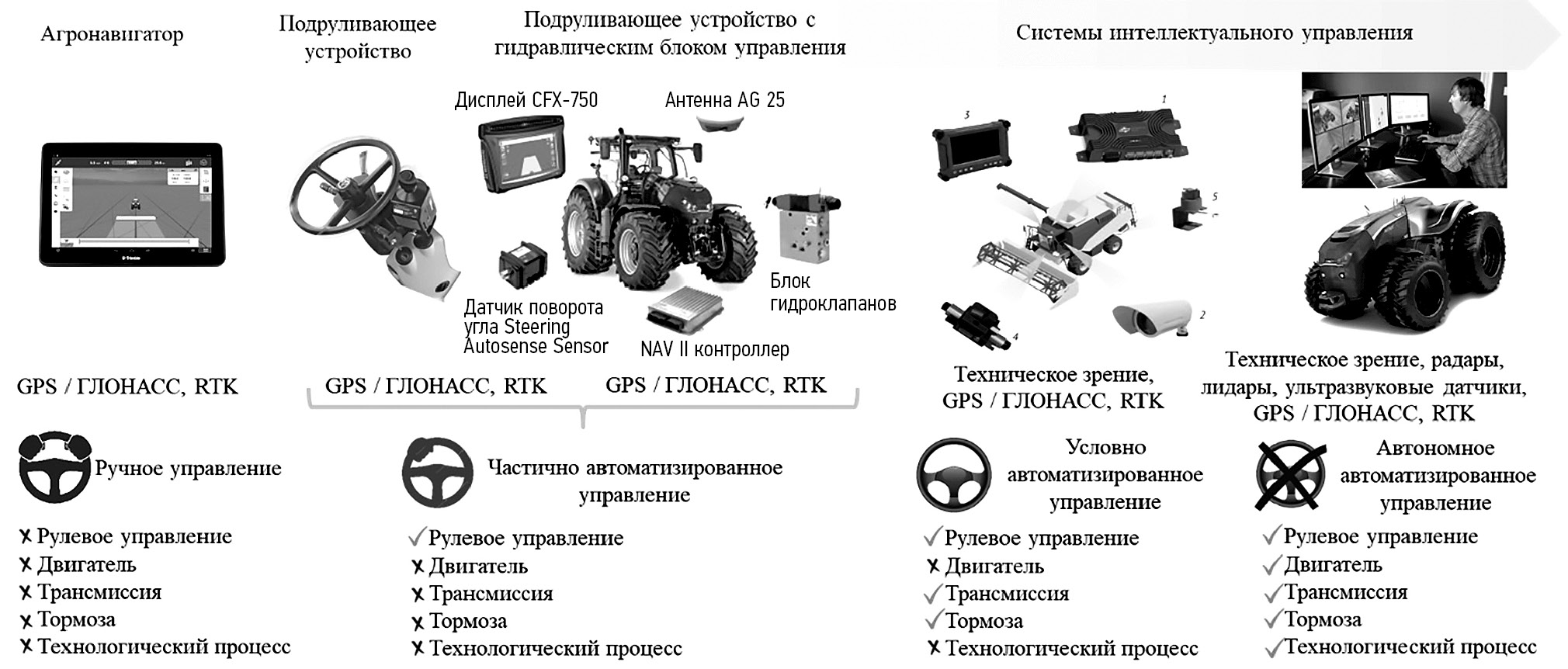 Серийно выпускаемые и уже находящие массовое применение системы параллельного и автоматического вождения на основе систем геопозиционирования GPS / ГЛОНАСС и нейронных сетей обладают достаточно высокими функционалом и точностью, универсальностью, доступностью и позволяют уже в настоящее время автоматизировать часть процессов управления МЭС. Дальнейшее развитие интеллектуальных технологий в сельском хозяйстве позволяет реализовать новые подходы к управлению сельскохозяйственной техникой. Разработка и применение в сельскохозяйственной технике технологий машинного зрения, различного рода датчиков и сенсоров, электронных систем управления, технологий беспроводной передачи данных, интернета вещей и т. п. позволяет создавать беспилотные машины, обеспечивающие повышение качества проведения технологических операций, достаточно высокую точность и безопасность вождения, автономность, что в последствии даст возможность исключить оператора, находящегося непосредственно в кабине, и перейти к применению беспилотных МЭС, контролируемых оператором дистанционно из диспетчерского пункта [15].