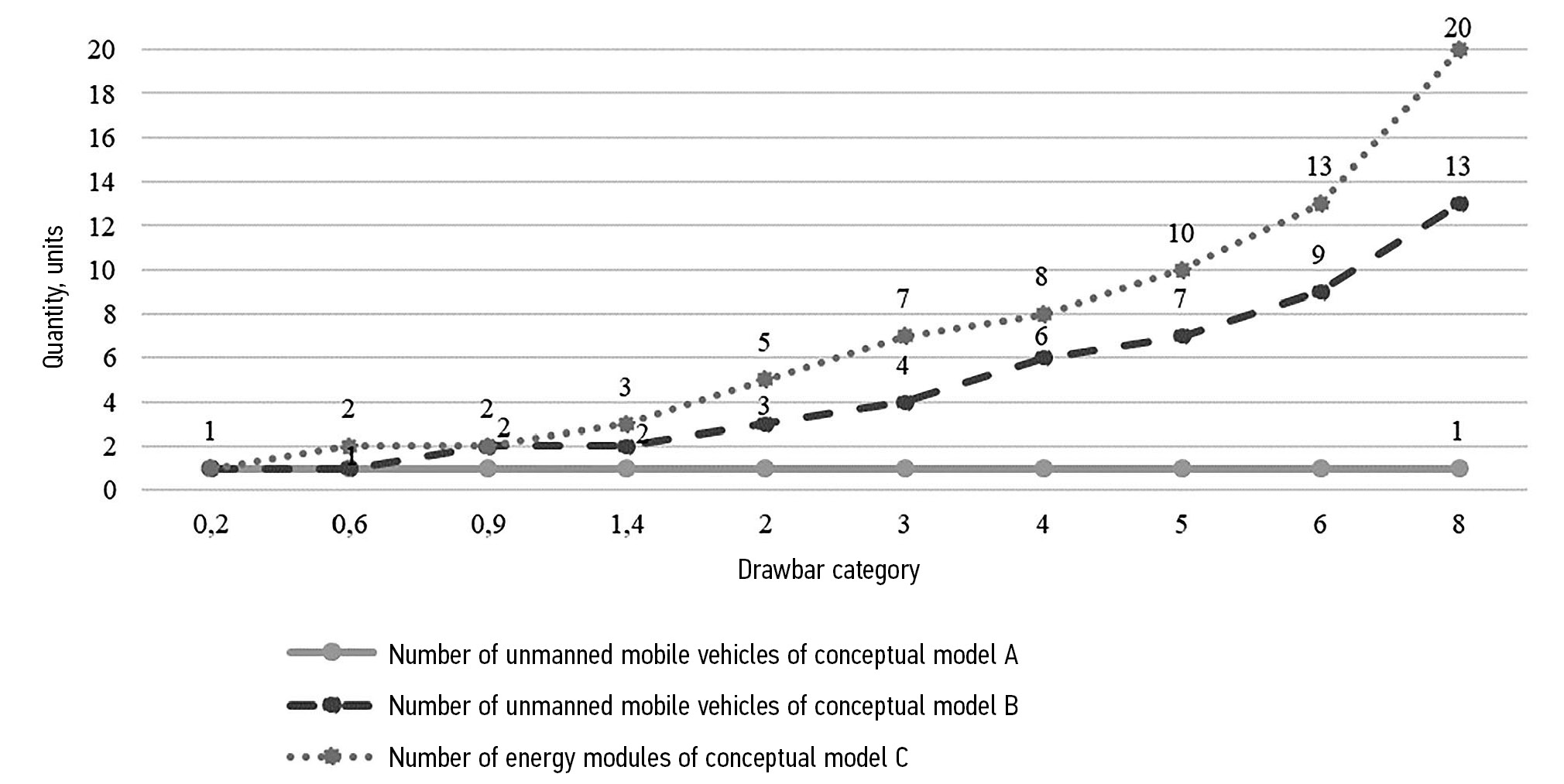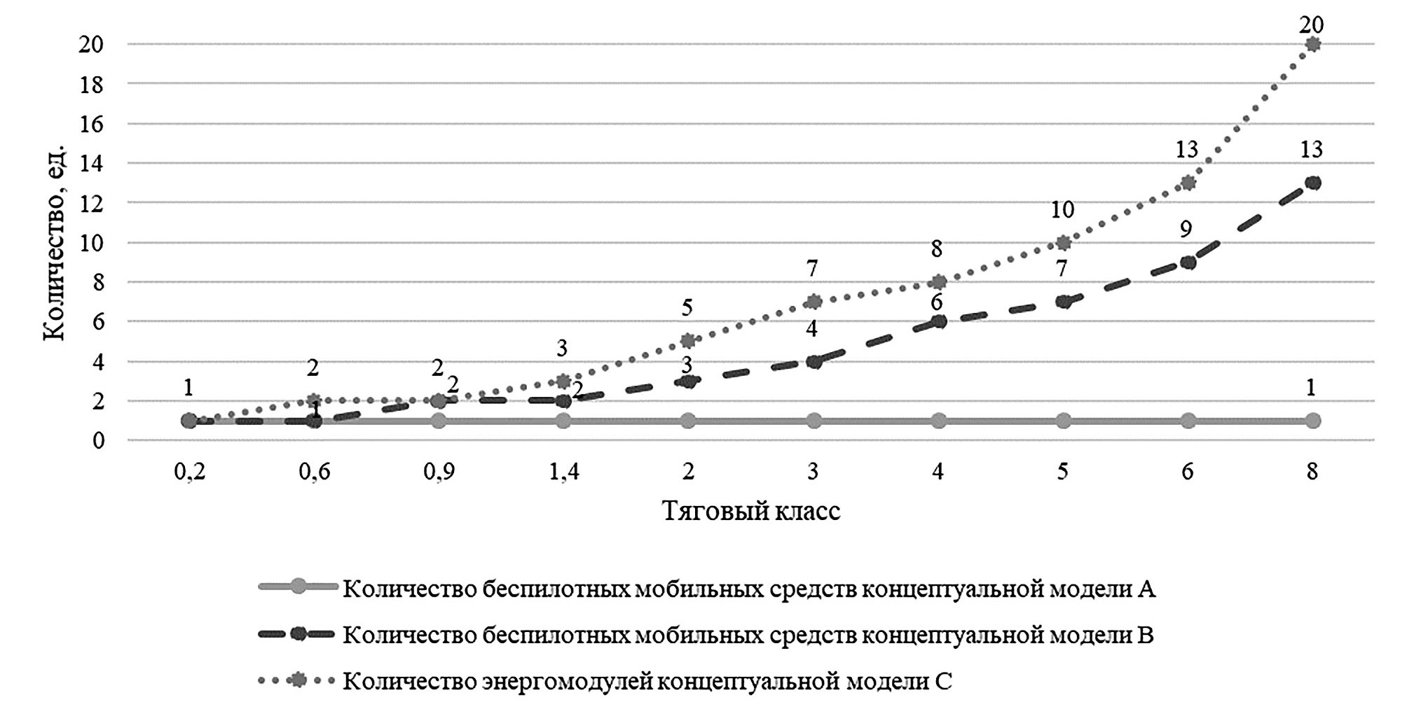 В соответствии с данной методикой произведены расчёты и построен график (рис. 4), отражающий зависимость количества беспилотных МЭС концептуальных моделей А, В и С от тягового класса базового трактора (при расчётах произвели округление эквивалентного количества до целых чисел).