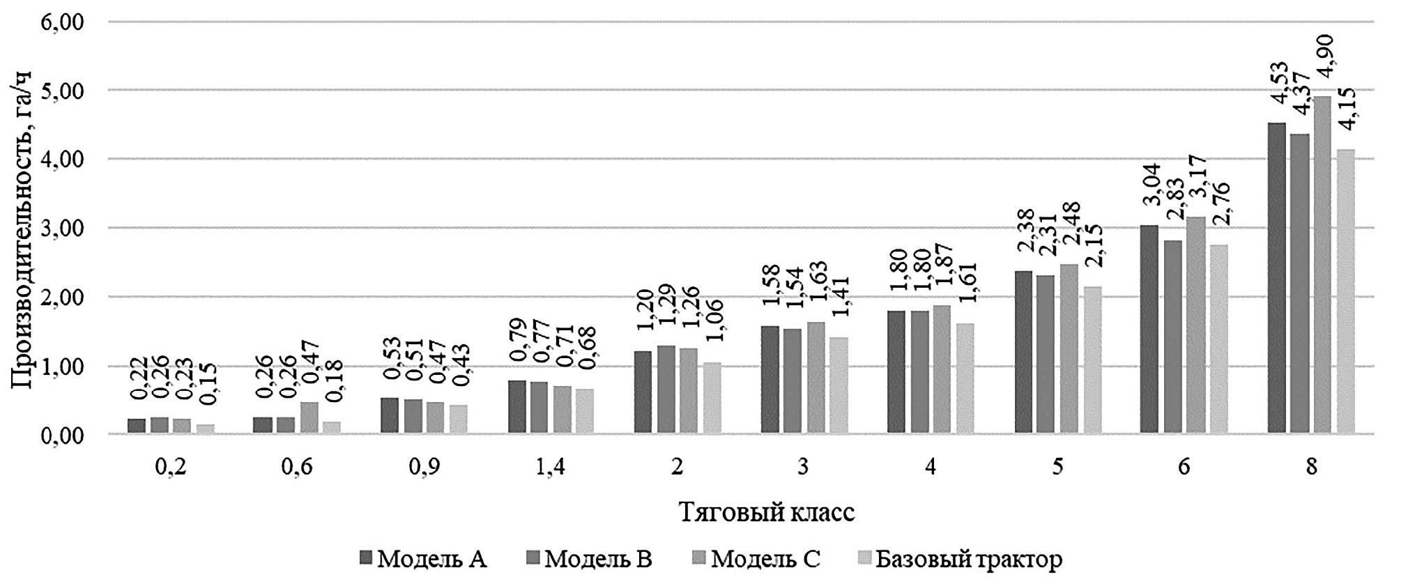 Результаты расчёта часовой производительности пахотных агрегатов в составе с базовыми тракторами и беспилотными МЭС различных концептуальных моделей соответствующих тяговых классов представлены на рис. 5.