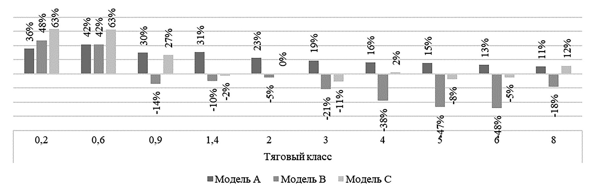 Приведённые на рис.6 данные показывают, что использование беспилотных МЭС концептуальной модели А во всех тяговых классах может позволить снизить себестоимость выполнения работ на 11–42%. Использование беспилотных МЭС концептуальной модели В может оказаться эффективным по сравнению с базовыми тракторами только в тяговых классах 0,2–0,9. Снижение себестоимости выполнения работ при использовании беспилотных МЭС концептуальной модели С возможно достигнуть только в тяговых классах 0,2–0,6, 8. В остальных случаях применение беспилотных МЭС концептуальных моделей В и С может приводить к увеличению себестоимости пахотных работ.
