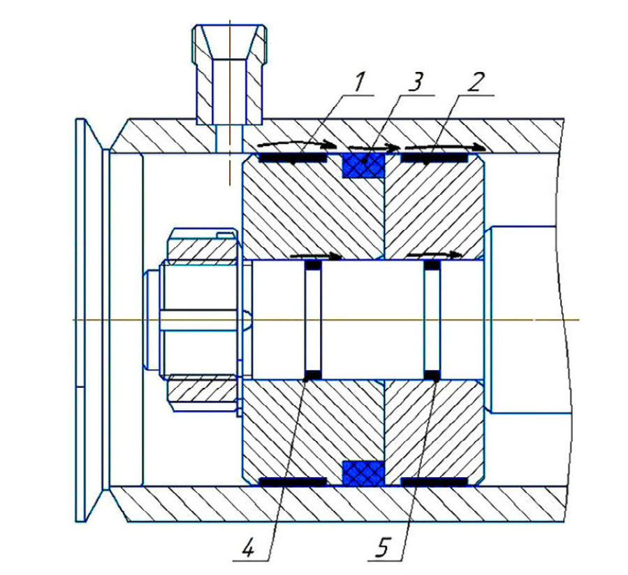 Рис. 1. Примерная схема перетечки жидкости через уплотнения поршня: 1, 2 — направляющие кольца, 3 — уплотнительное кольцо, 4, 5 — штоковые уплотнения поршня.