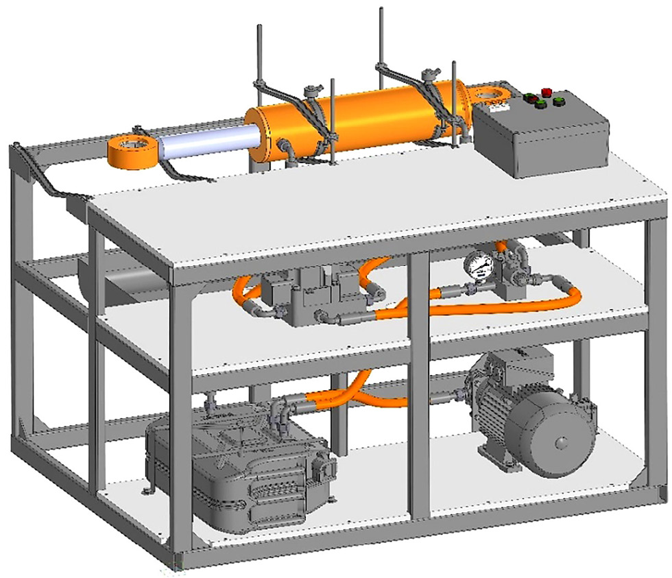 3D-модель стенда, собственной конструкции, представлена на рис. 3. В качестве привода гидронасоса используется электродвигатель марки АИР 112 М4 с мощностью 5,5 кВт, с частотой вращения 1440 об/мин и крутящим моментом 36,5 н‧м. Использован гидронасос марки НШ 10 Г-3 с рабочим объёмом 10 см3, c подачей 21 л/мин, с максимальной частотой вращения 3600 об/мин, с номинальным давлением 16 МПа. В качестве трубопроводов используются рукава высокого давления с предельным рабочим давлением 40 МПа. В качестве рабочей жидкости использовано гидравлическое масло с товарной маркой ВМГЗ.