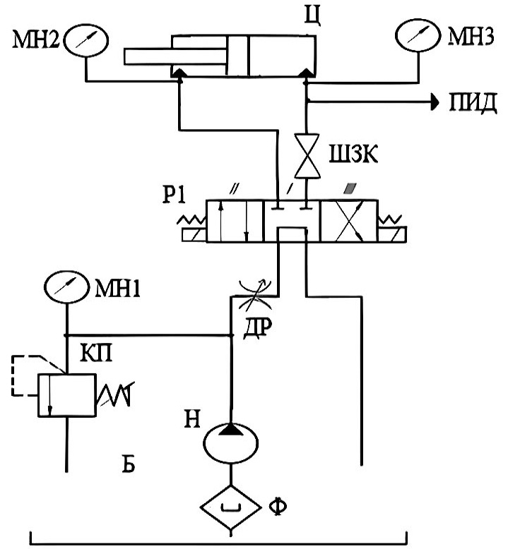 Fig. 4. Schematic hydraulic diagram of the bench: Б — a tank, Ф — a filter, Н — a pump, КП — a safety valve, ШЗК — a ball shut–off valve, МН1 — a pressure gauge, ДР — an adjustable throttle, P1 — a hydraulic distributor, МН2 and МН3 — secondary excessive pressure gauges at circuit branches, ПИД — an excessive pressure transmitter, Ц — a studied hydraulic cylinder.