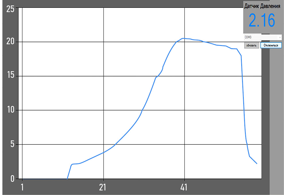 Компьютерная программа была написана в среде Arduino IDE и позволяет анализировать аналоговый сигнал и преобразовать его в цифровой, затем представляя в виде графика зависимости давления от времени. В интерфейсе программы есть две команды «Обновить» и «Подключиться». Под командой «Обновить» понимается, что при её нажатии автоматически выбирается порт подключения в АПС. Команда «Подключиться» соответственно означает установить связь с портом подключения. По результатам проведённого опыта получаем график зависимости давления от времени.