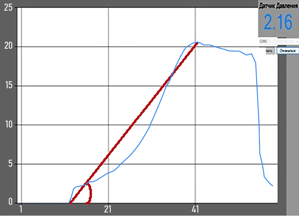 На компьютере при проведении испытания автоматически строится график повышения давления. На графиках по оси X отложено время в секундах, а по оси Y давление в мегапаскалях (Мпа). Интервалы между вертикальными осями на графике равны 10 секундам. По отклонению от эталонных значений графика судят о техническом состоянии испытуемого гидроцилиндра. Пример графиков эталонного и неисправного гидроцилиндра представлены на рис. 7 и 8 соответственно.