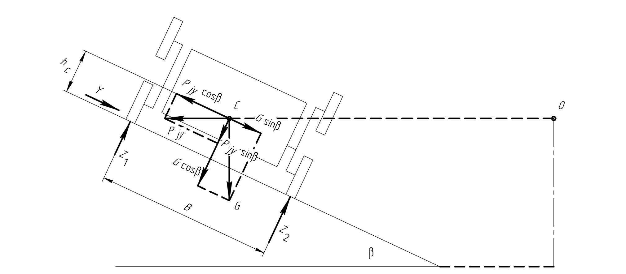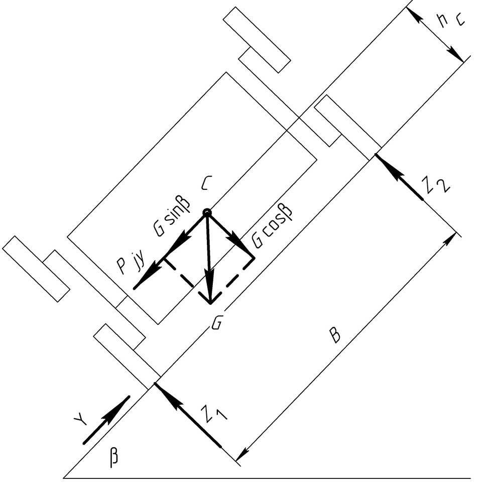 In Fig. 2, the following designations are used С is center of gravity of the platform; В is the track width; hc is the height of the center of gravity; β is the angle of transverse inclination of the supporting surface; G is the platform weight; Z1,2 represents normal reactions under the wheels of the inner (lagging) and outer (advancing) sides; and Y is the total transverse reaction balancing the transverse force because of the action of inertia.