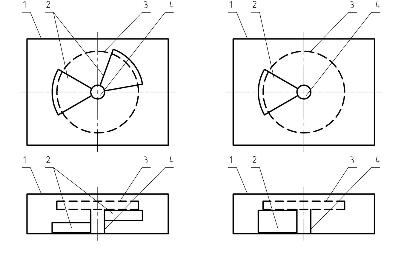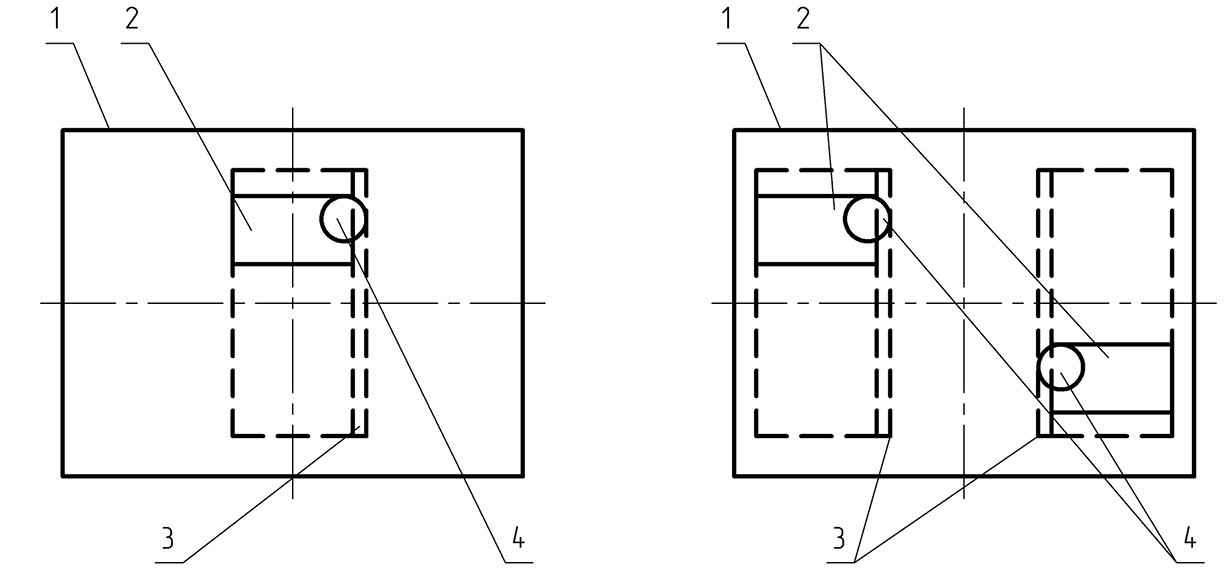 Figure 5 presents a simplified diagram of a stabilizer with transverse movement of the load, featuring single-mass (left) and dual-mass (right) configurations. The numbers indicate a vehicle body (1), weights (2), rack on the guide frame (3), and drive unit (4). Unlike a stabilizer with a rotating mass, this design does not require an RBJ, significantly simplifying the unit and increasing reliability. Although this stabilizer does not allow controlling the redistribution of masses along the axes, it is simpler in design and more compact in the single-mass version.