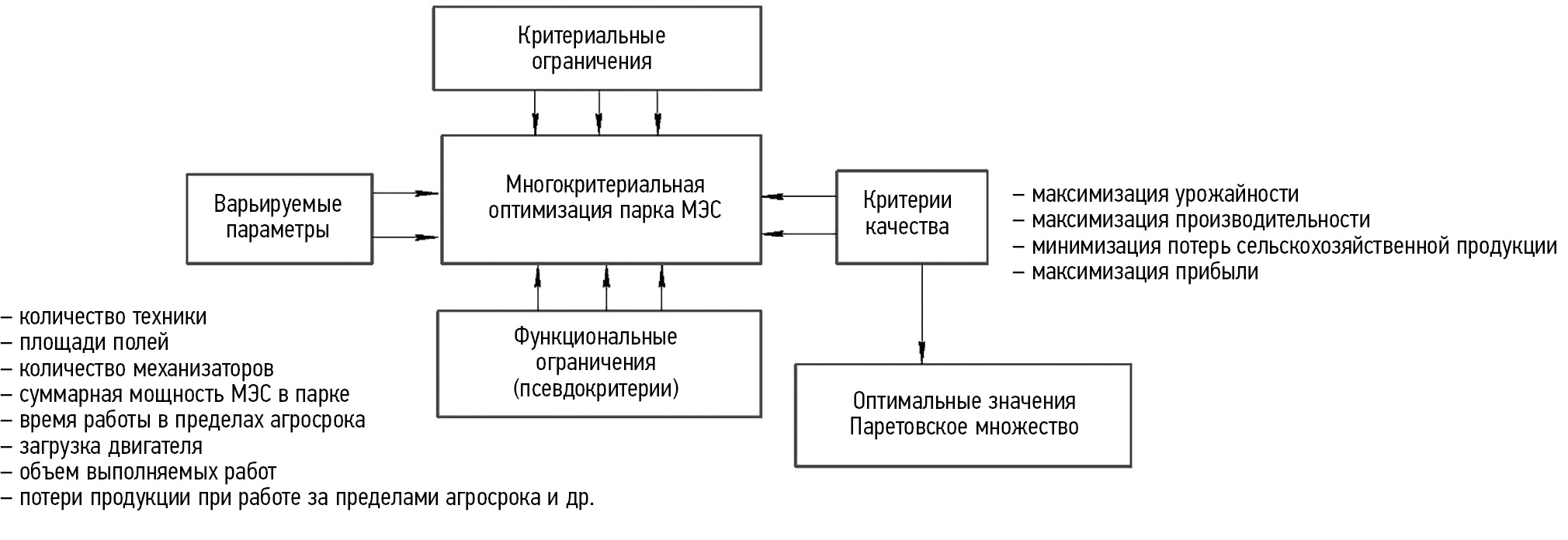 Согласно анализу решения подобных задач в других отраслях промыщленности, нами была установлена следующая постановка решения многокритериальной задачи для принятия компромиссных решений по эффективности парка сельскохозяйственных МЭС (рис. 1).