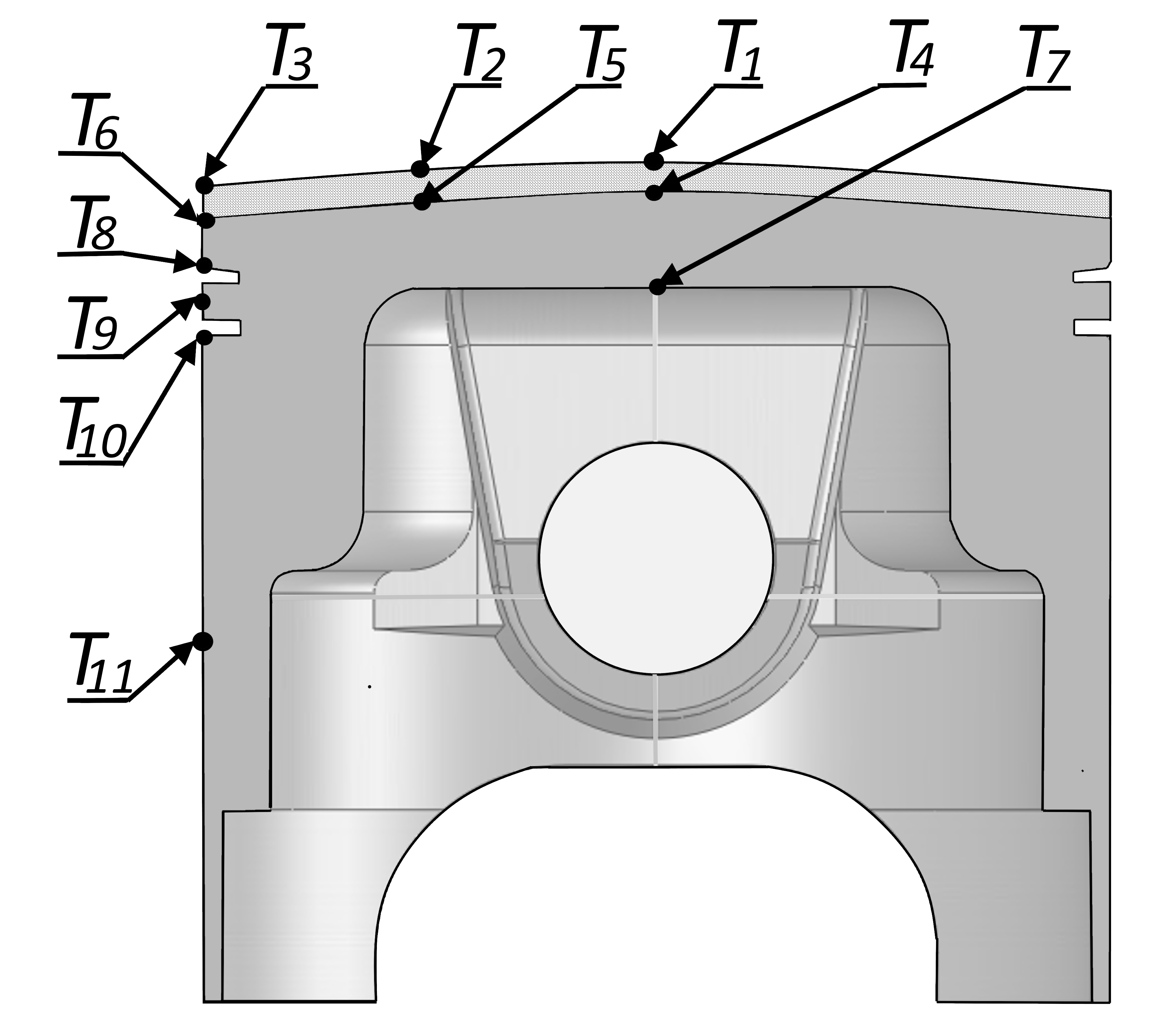 The thermal state of the piston was calculated after creating the finite element mesh.. Next, the piston temperature was determined at specific points. Their location is presented in Fig. 3.