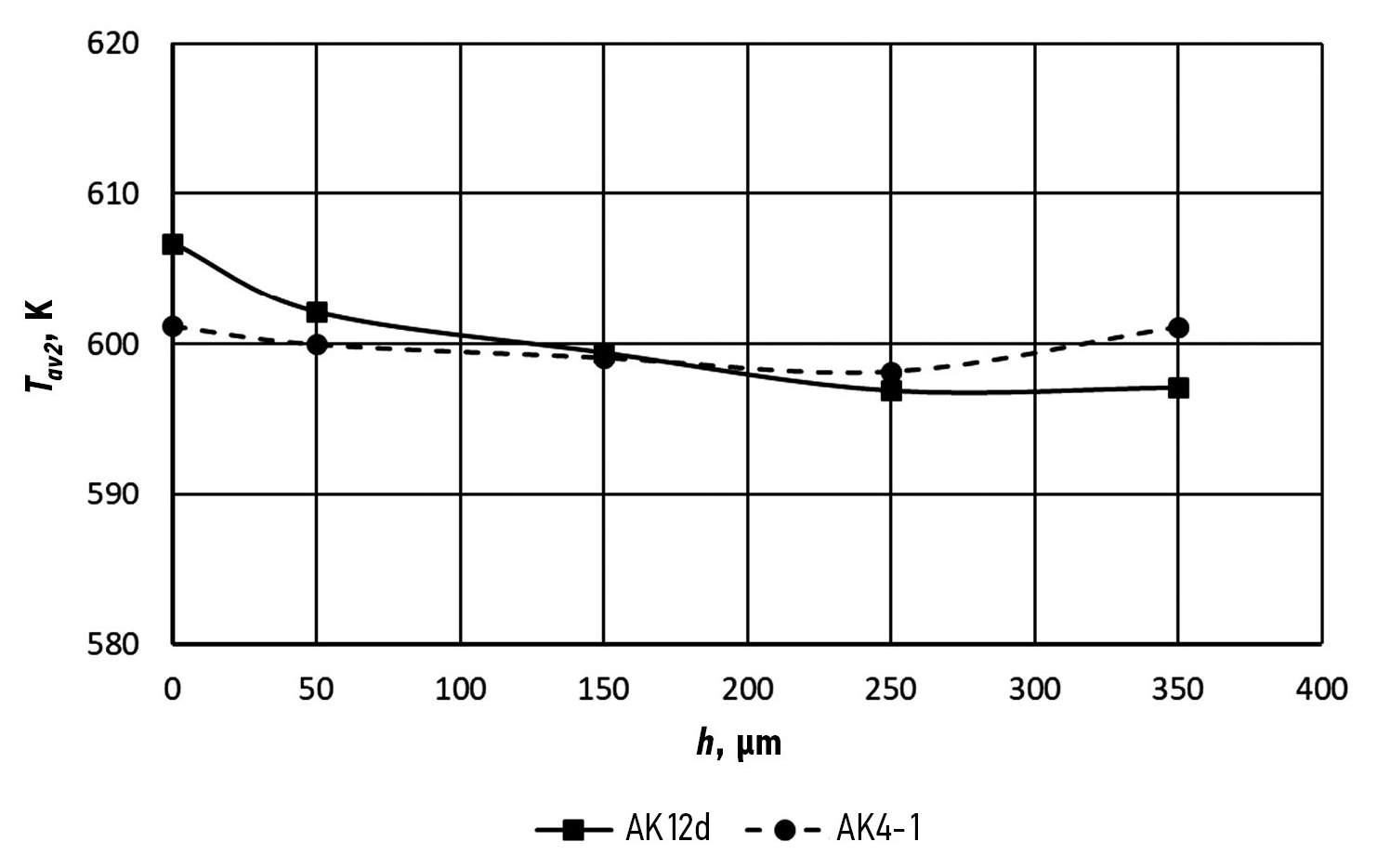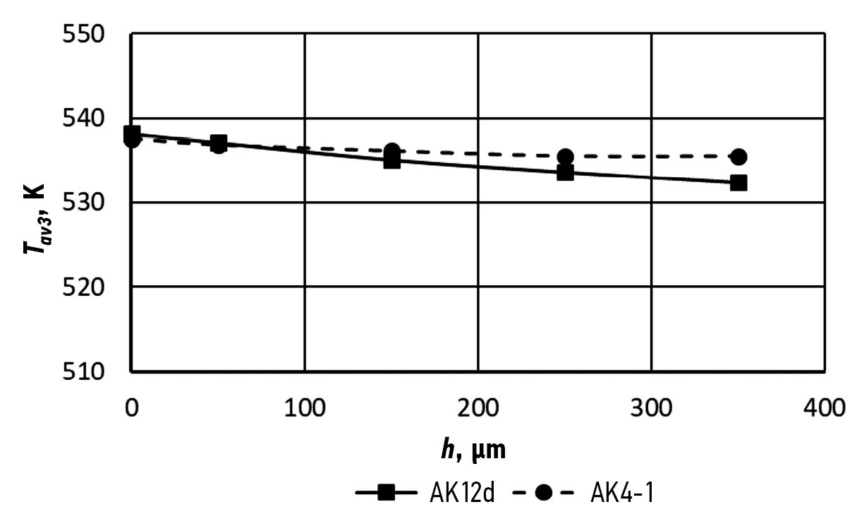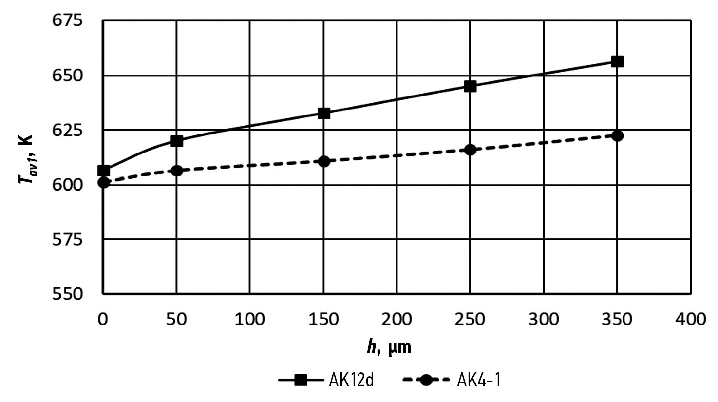 The MAO coating helps to increase the temperature on its surface, such that the lower the thermal conductivity coefficient of the ceramic coating, the higher this temperature becomes (Fig. 4). The MAO coatings on the AK12d and AK4-1 alloys have thermal conductivity coefficients of 1.6 and 4.5 W/(m∙K), respectively. As a result, with a ceramic coating thickness of 350 μm, a temperature increase of 50 K is registered on the surface of the AK12d alloy piston; under the same conditions, the temperature increase on the AK4-1 piston crown is recorded at 21 K (Fig. 4). The dependence of the average temperature on the coating surface Tav1 for pistons made of different alloys can be represented by the following equations:
