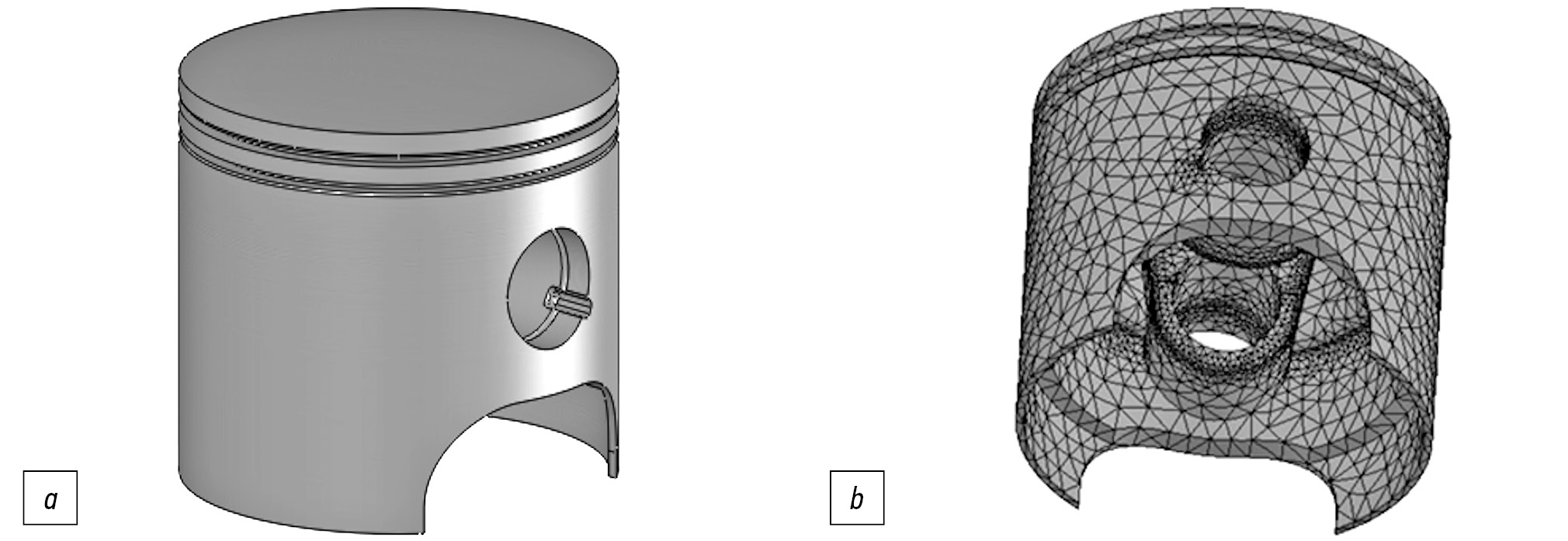 Рис. 1. Модель поршня двигателя: а — 3D-модель в SolidWorks; b — модель с сеткой.