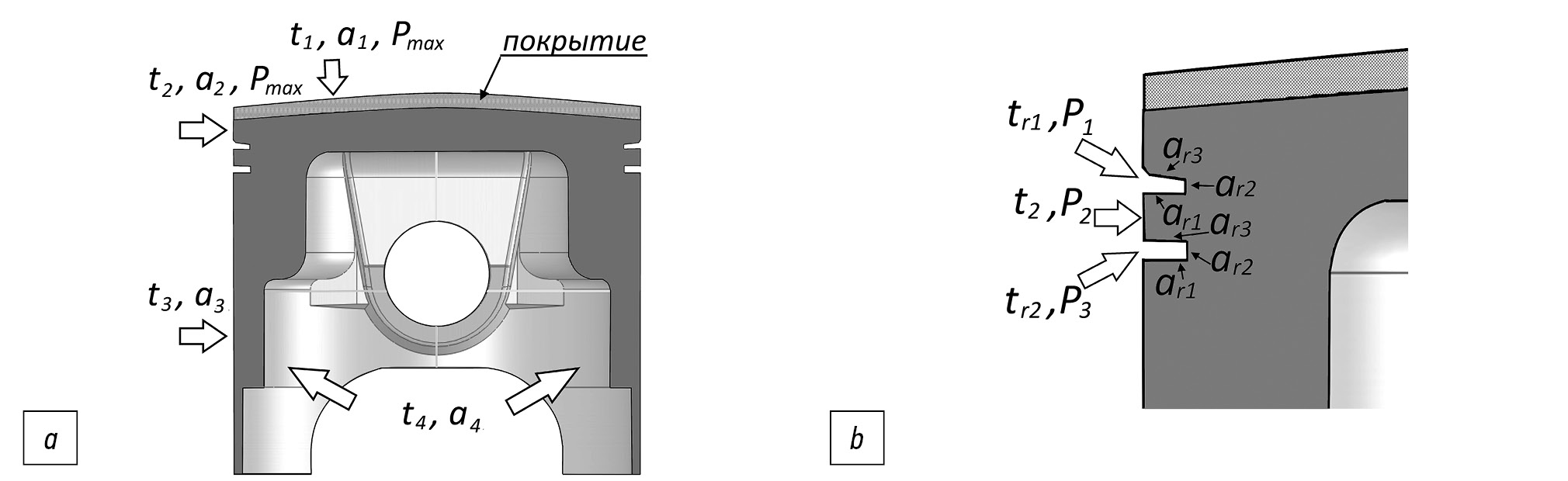 Рис. 2. Схема температурных и механических нагрузок: а — на основных поверхностях поршня; b — на поверхностях поршневых канавок.