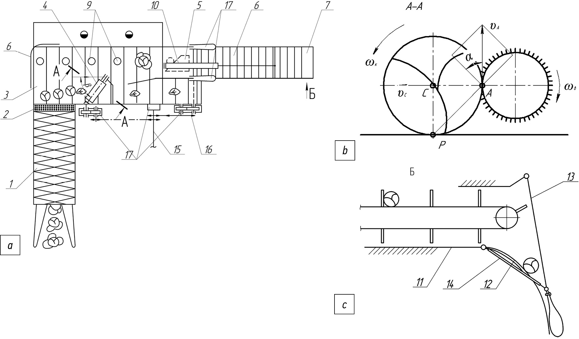 Рис. 1. Схема компоновки капустоуборочного комбайна: а — общий вид; b — разрез вальца А-А, c — вид Б.
