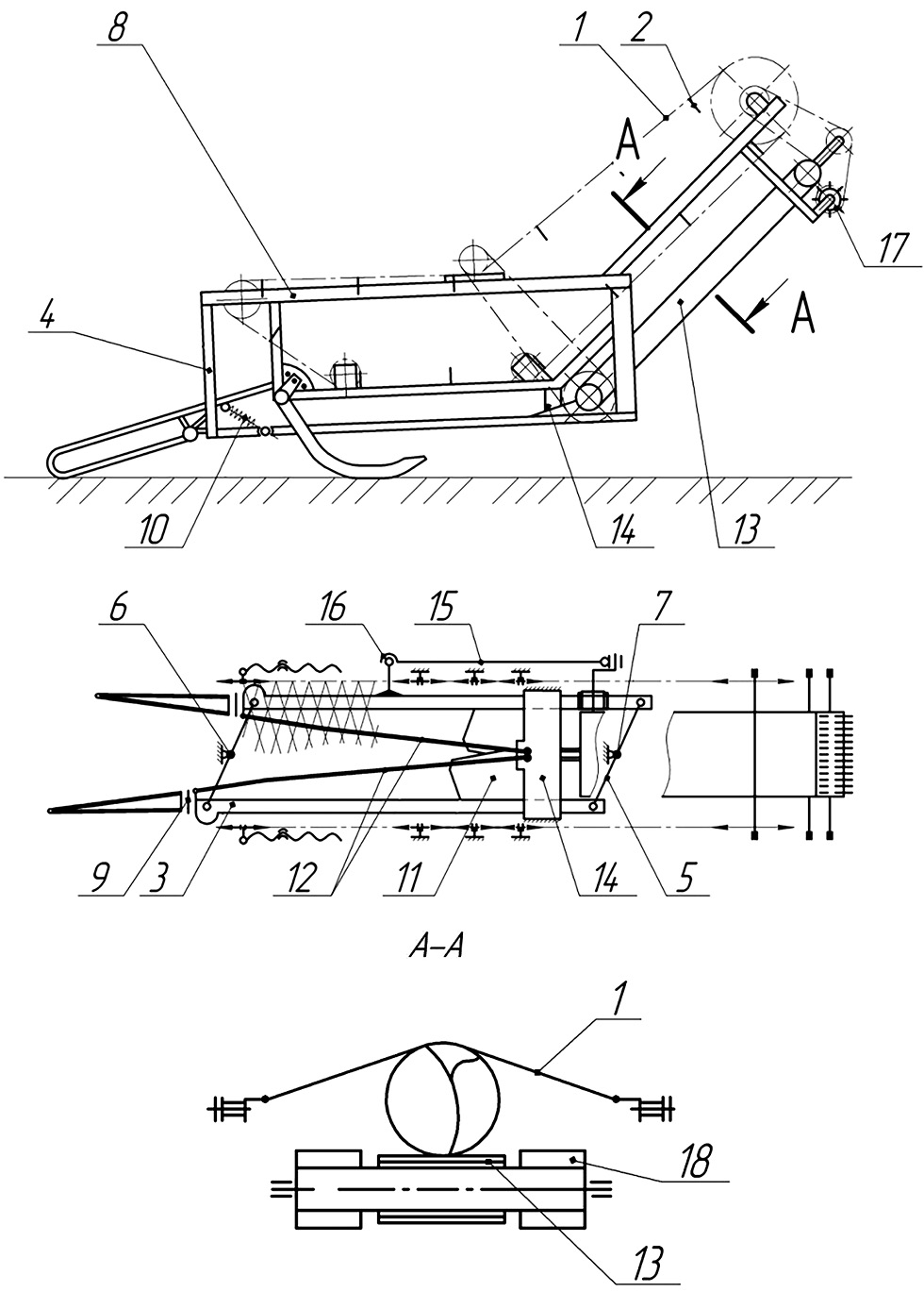 Конструкция режущего аппарата (рис. 2), как было замечено, «основана на использовании колеблющихся рабочих поверхностей для выравнивания полёглых растений капусты при подводе к режущему устройству. Он содержит прижимное устройство в виде эластичного сетчатого полотна 1 с поперечными жёсткими распорками 2, колеблющиеся боковины 3, скреплённые шарнирно между собой в виде паралеллограммного механизма П-образными передней 4 и задней 5 подвесками, закреплёнными своей центральной частью посредством шарниров 6 и 7 к раме 8. Передние части боковин 3 (лифтеры) имеют в продольно-вертикальной плоскости возможность копировать рельеф почвы за счёт шарниров 9 под действием пружин 10, а задние части боковин оснащены плоскими клиновидными ножами 11. Кроме того, боковины 3 снабжены направляющими 12, соединёнными с ними шарнирно в передней части» [21].