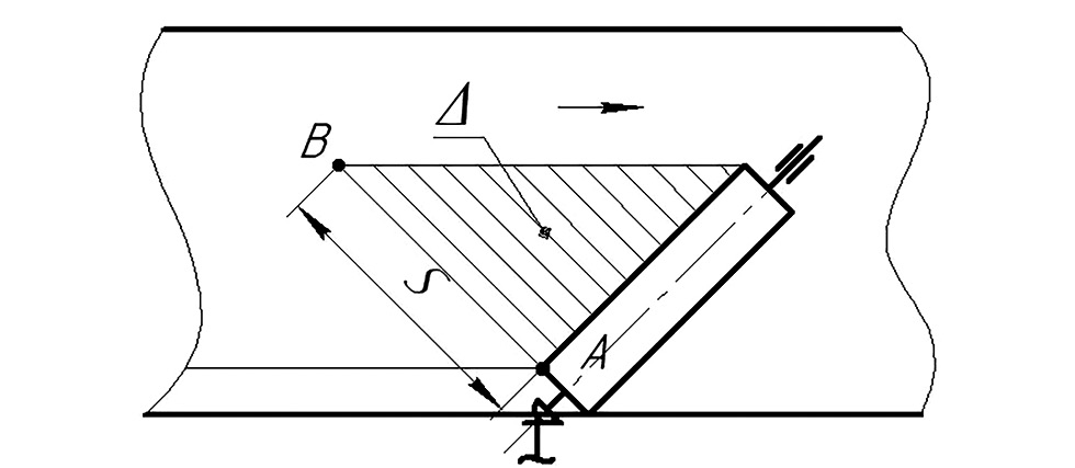 Заметим, что в данном устройстве для избегания скопления кочанов перед вальцом необходимо сообщать им в ходе взаимодействия с ним кинетическую энергию Т в таком количестве, чтобы её хватило откатываться на полотне транспортёр-обрезчика за пределы зоны действия вальца (рис. 3), т.е. на пути от А до В (это наиболее худший случай). В противном случае кочаны снова будут доставлены полотном транспортёр-обрезчика к вальцу и образуется там затор.